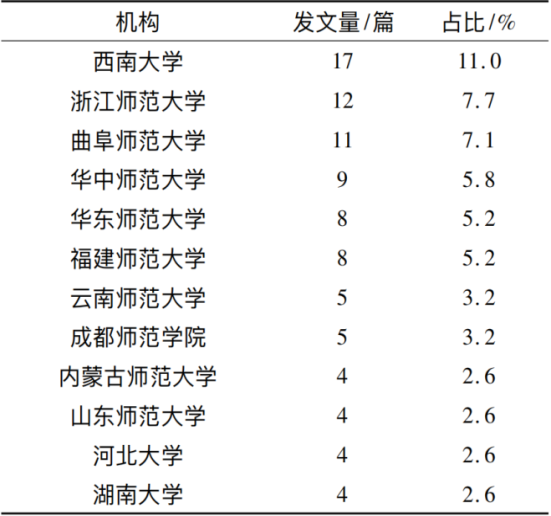 对研究机构的分析可以反映该机构在少先队员组织认同领域的研究能力和影响力。从表2(表中列出的是发文在4篇及以上的机构)中可以看出,涉及该研究方向的研究机构以师范类高校为主,较为突出的是西南大学教育学部,它是少年儿童组织与思想意识教育专业率先招收研究生的高校之一,2013—2019年共发表文献17篇,占比11.0%,其中硕士论文12篇,期刊5篇;其次是浙江师范大学和曲阜师范大学,分别发文12篇(占比7.7%)和11篇(占比7.1%);华中师范大学发文9篇,且文献多以硕士论文为主;华东师范大学和福建师范大学各发文8篇;云南师范大学和成都师范学院各发文5篇;内蒙古师范大学、山东师范大学、河北大学和湖南大学各发文4篇,各占比2.6%,且均是硕士论文;中小学关于教学实践的期刊论文有9篇,占比5.8%,且多为一线教师联合发文;还有4篇是共青团组织、团校等其他机构的论文,占比2.6%。师范院校率先成立少年儿童组织与思想意识教育二级学科专业,逐步建立了专业的学术研究梯队。当然,每个学校的研究方向还有差异,西南大学教育学部学科基础扎实,团队研究实力较强,它侧重于少先队组织建设研究,从宏观视角来强化少先队员的组织意识教育;浙江师范大学以组织制度建设研究来促进少先队员的组织观念培养;曲阜师范大学主要侧重少先队组织活动机制建设研究。各地对该学科建设的重视程度不同,造成学术成果产出的不同。西南大学最早成立少年儿童与思想意识教育研究中心,目前在该领域研究实力较强,受到教育部和团中央的重视。