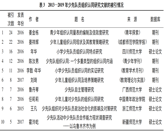 表3 2013-2019少先队员组织认同研究文献的被引情况