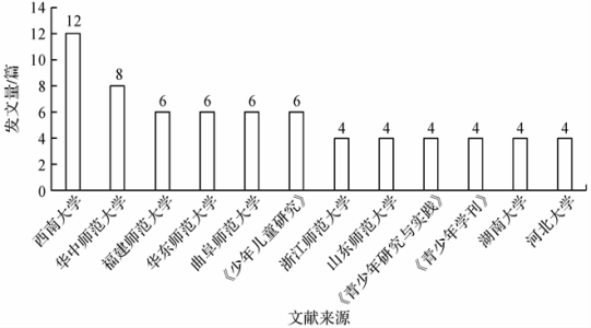 从文献来源数据可以看出研究的发展重点。2013—2019年关于少先队员组织认同研究共有153篇,发文量(含研究生学位论文)在4篇以上(含4篇)的来源分布数据如图2所示。全国高校中,西南大学发文最多,累计12篇,占比7.8%;华中师范大学发文8篇,华东师范大学、福建师范大学和曲阜师范大学各发文6篇,各占比3.9%;浙江师范大学、山东师范大学、湖南大学和河北大学各发文4篇,各占比2.6%。期刊相关发文数量为:《少年儿童研究》载文量最高,占文献总数的3.9%;其次是《青少年研究与实践》和《青少年学刊》分别载文4篇,各占2.6%。综合上述统计可以看出,高校仍是少先队员组织认同研究的主要来源,其中以在全国率先开设“少年儿童组织与思想意识教育”专业的西南大学为首。在西南大学12篇硕士论文中,对于少先队员组织认同的研究是分别从“少先队标识”“小学班主任兼任中队辅导员”和“少先队社区活动”等方面开展的。