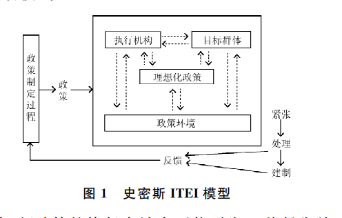ITEI模型认为,新政策的执行在社会可能引发一种紧张关系,这种关系使得执行者和目标群体支持或拒绝进一步执行政策,政策执行效果通过反馈机制又影响政策制定过程。政策执行的过程实际上是在既定的环境因素下,执行机构与目标群体之间在目标和手段方面相互调适的动态平衡过程和双向的信息交流过程。其中,政策执行机构之间的合作与冲突、目标群体的价值取向与利益诉求、外部环境的文化制约和制度制约,使得政策执行过程充满复杂性和挑战[16]。具体地说,执行机关的结构和人员、主管领导的理解和态度、执行的能力与信心,目标群体的组织或反应,以及政策执行的经验,文化、社会经济与政治环境,均是政策执行过程中影响其成败的因素。