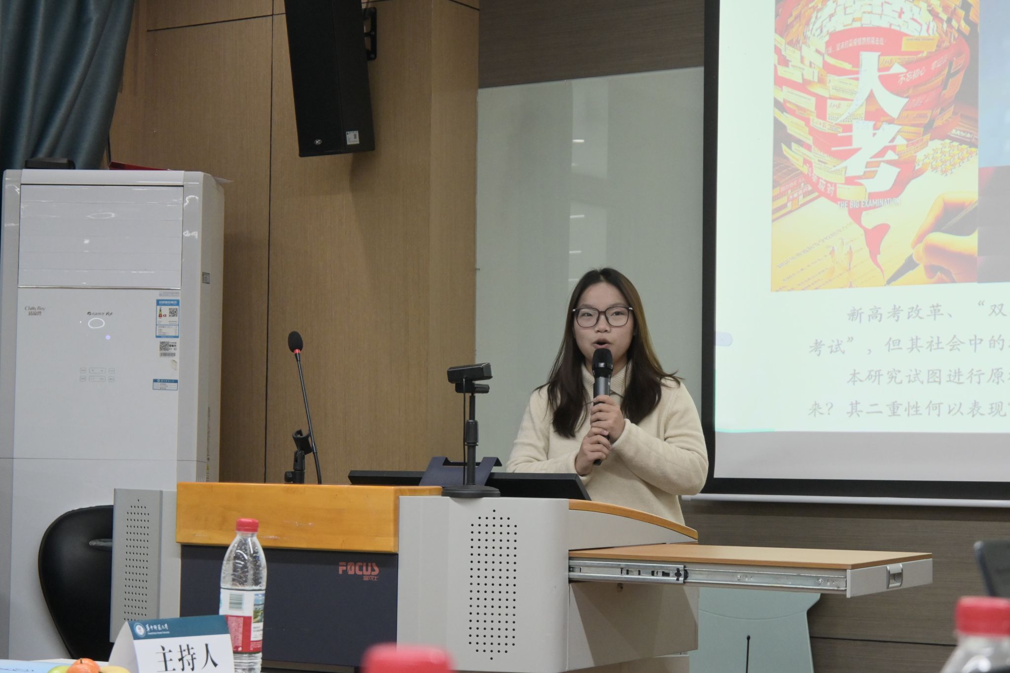 华中师范大学博士生王健怡作了题为“高利害性考试的制度效能及其道德风险”的报告。她首先分析了考试制度的高利害性根源,指出即便有新高考改革等政策调整,其社会地位反而更加固化,点明考试制度与社会资源分配的深层绑定关系,进而阐述了高利害性考试的双重价值和三重道德风险,最终提出了高利害性考试道德风险的规避路径。