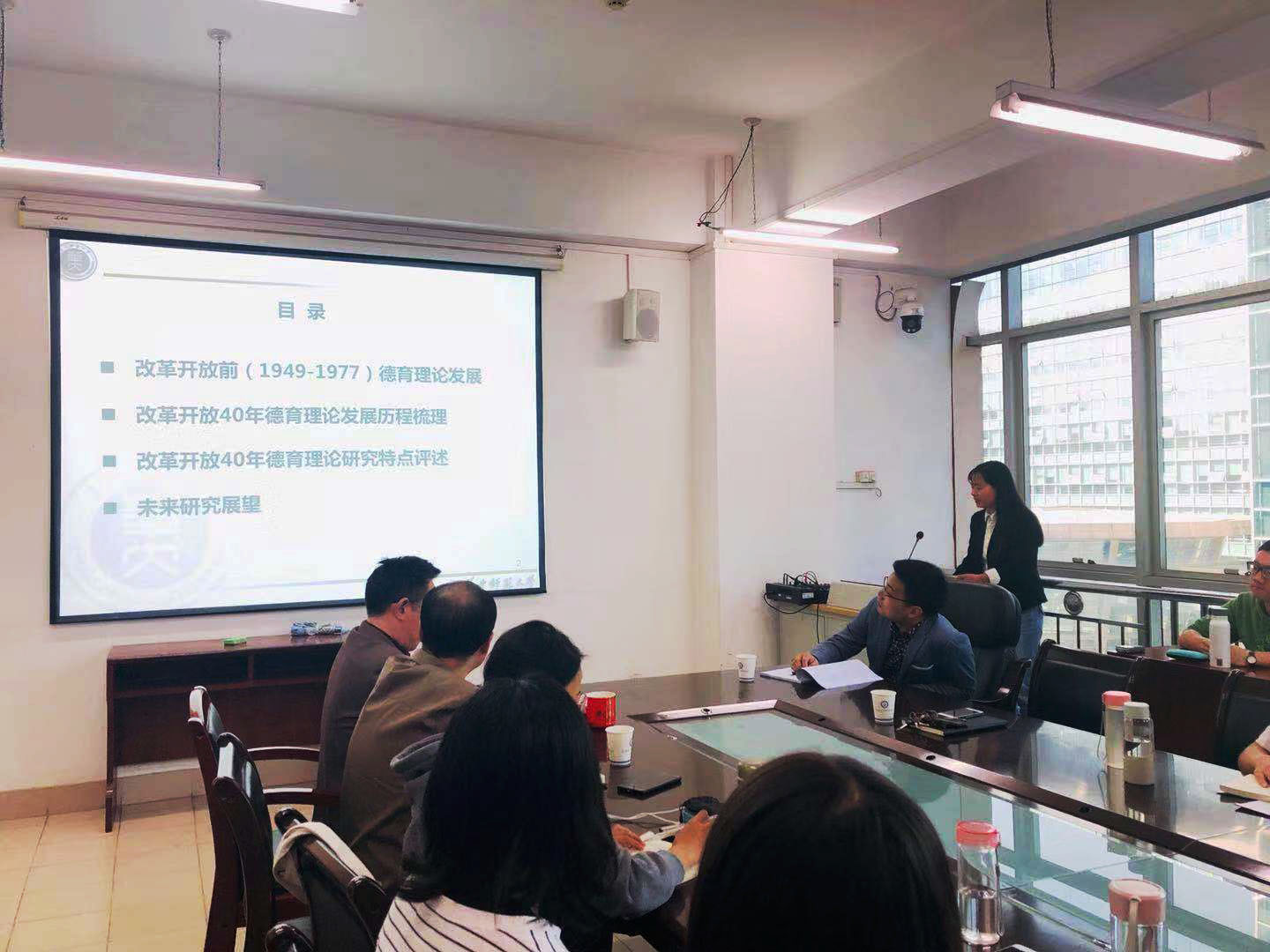 2018年10月26日下午,德育所学术沙龙在田家炳415教室如期举行。杜时忠教授、程红艳教授、周小李教授、卢旭副教授以及德育所全体硕博研究生参加了此次沙龙。此次沙龙围绕两大主题展开:一是程红艳教授的“改革开放四十年德育理论研究进程”专题报告;二是博士生闫昌锐的毕业论文《系统德育论》的修订研讨。