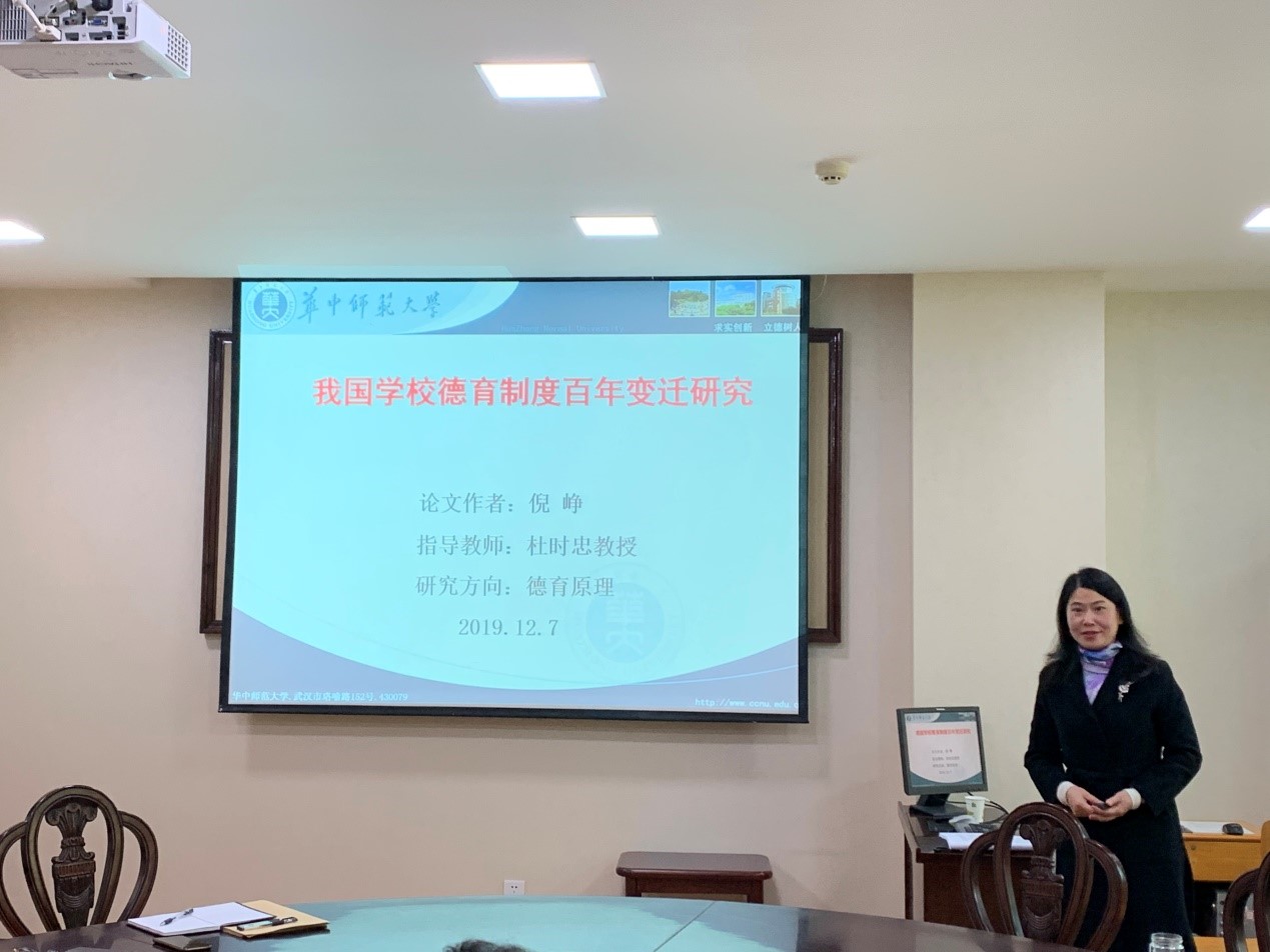 倪峥的博士答辩论文题目为《我国学校德育制度百年变迁研究》。运用历史研究和个案研究两种方法,她系统梳理了我国学校德育制度百年变迁的历史过程,在微观层面详细地