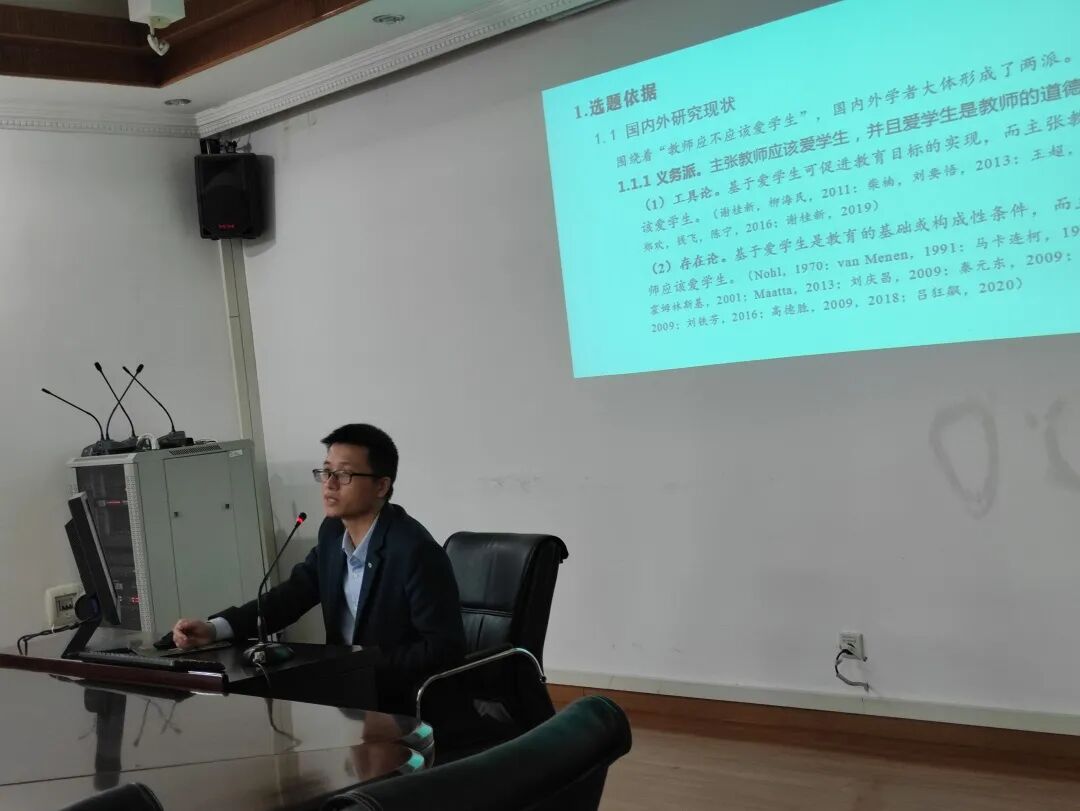 上半场,杨坚博士首先做“师爱的规范性考察”博士后选题报告。他指出,国内外对于“教师应不应该爱学生”的研究,大体分为义务派和非义务派,而这两派观点都有无法解释的问题。据此,他提出自己的研究关切,即“‘教师应该爱学生’所蕴涵的规范性问题”。围绕这一核心议题,具体探讨师爱的本质属性、师爱与教育之间的奠基性关系等等问题。