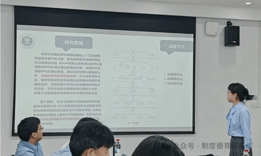 王健怡从研究背景与意义、研究设计与方法、研究内容与结论、研究创新及不足四个方面对论文展开阐述。她采用文献研究法、访谈法以及参与式观察法进行研究,发现了当前学校制度存在的激励失衡、取向狭隘、运行黑箱与执行偏颇等问题,从制度主体、组织内部以及外部环境三因素剖析了学校制度乏善的成因,最后提出培育伦理型校长与变革型教师、建立“文化-制度”耦合的长效机制、推动多元主体协同治理等策略。