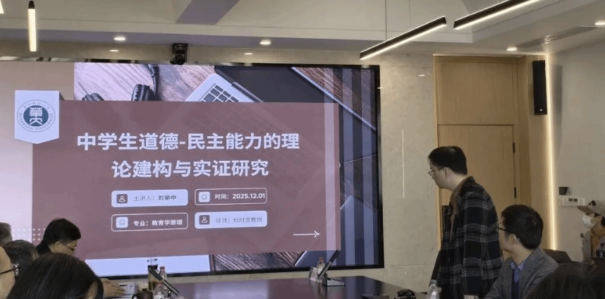 2025年12月1日,华中师范大学教育学院于田家炳楼903会议室举行了教育学原理专业、教育领导与管理专业博士毕业论文答辩会。教育学原理专业答辩会邀请了华中科技大学李太平教授作为答辩委员会主席,教育领导与管理专业答辩会邀请了杭州师范大学赵志毅教授担任答辩委员会主席,华中师范大学涂艳国教授、程红艳教授、田友谊教授任答辩委员,华中师范大学孙银光副教授担任答辩秘书,校内外数十名师生旁听答辩。