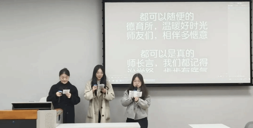 第二个节目是硕士生李香、徐思、张玉婵带来的歌曲《暖暖》,她们紧密围绕德育所师生平日学习与生活的点滴细节改编歌词,字里行间流淌着朴实而真挚的温情。表演结束,台下响起持续而热烈的掌声,现场洋溢着感动与欢乐的氛围。