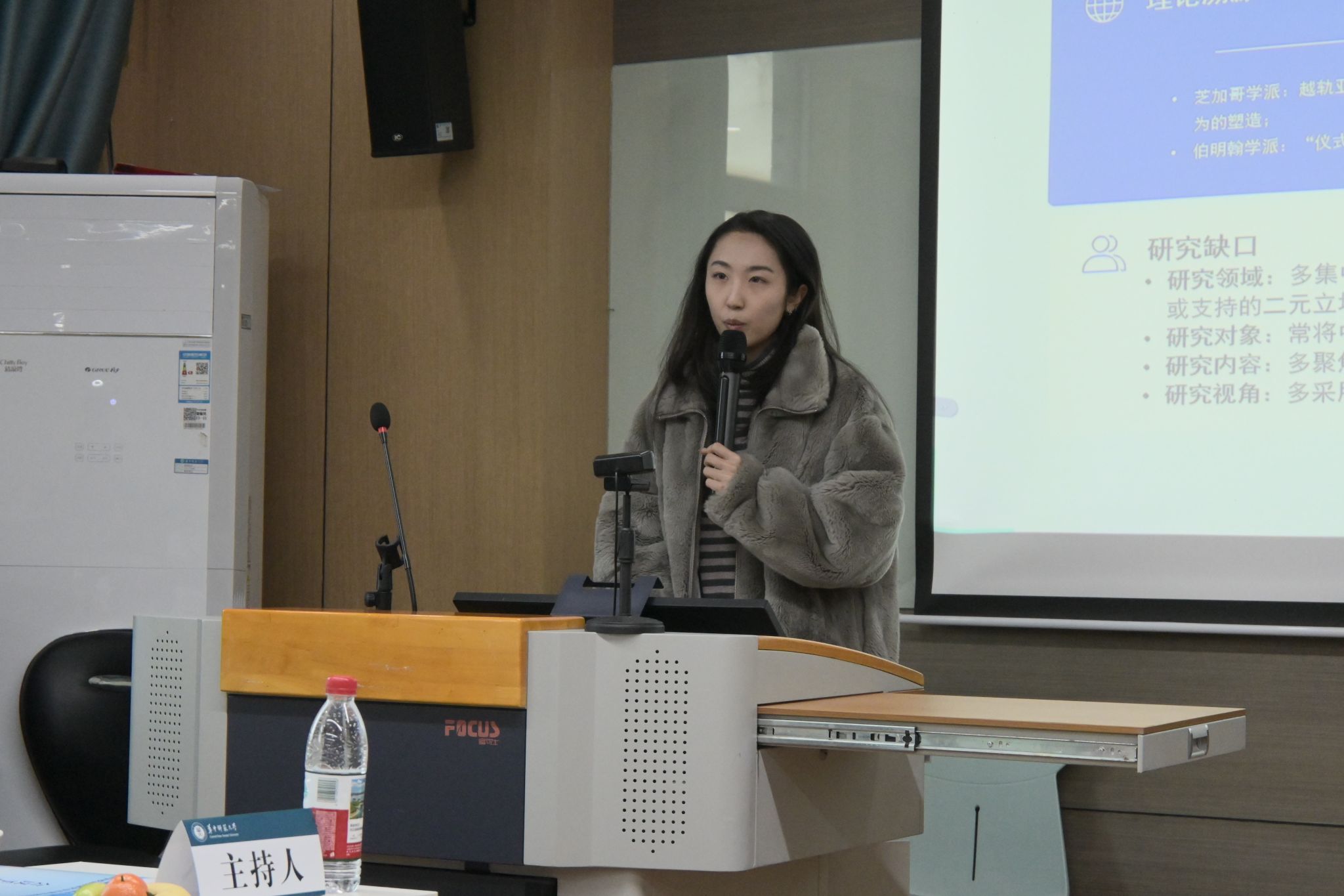 华中科技大学硕士生李芊颖作了题为“后亚文化视域下初中生二次元文化消费行为研究:实践逻辑、心理动因与教育调适”的报告,她首先介绍了二次元文化消费行为研究的背景,梳理了推动二次元文化发展的三大驱动力,进而分析了二次元文化在教育中的辩证作用,指出它既是跨文化理解的天然场域,又存在教育风险,最终在教育干预上提出了三重专项教育建议。