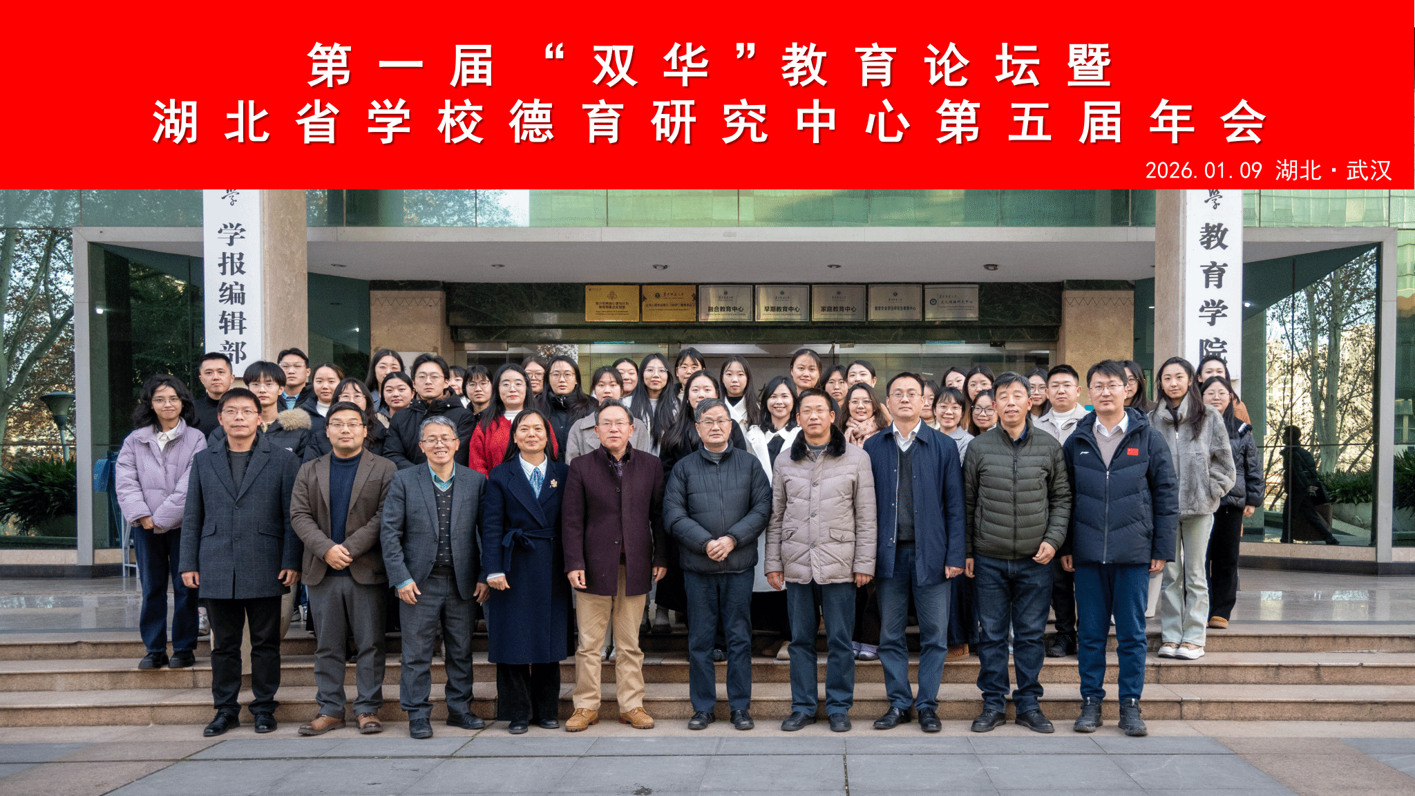 2026年1月9日下午2点30分,第一届“双华”教育论坛暨湖北省学校德育研究中心第五届年会在华中师范大学隆重召开。本次会议由华中师范大学道德教育研究所主办,华中科技大学教育科学研究院教育学研究所协办,近五十名两校的专家学者、硕博学生共聚一堂,畅谈学术。