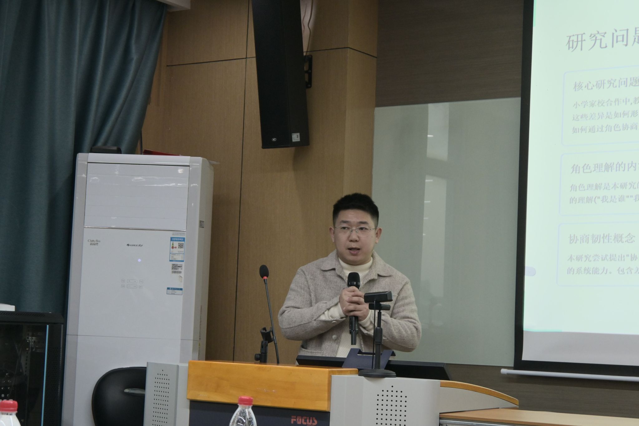 华中科技大学硕士生程侃作了题为“小学家校合作中教师与家长角色理解差异研究——表现、机制与优化路径”的报告。他聚焦教师与家长角色认知差异这一结构性矛盾,将研究视角从教师单维韧性转向家校双向互动。通过问卷和访谈的混合研究方法,提出了差异形成的“结构文化行动”三维分析框架,最终从制度、学校、能力三个层面提出了解决思路。