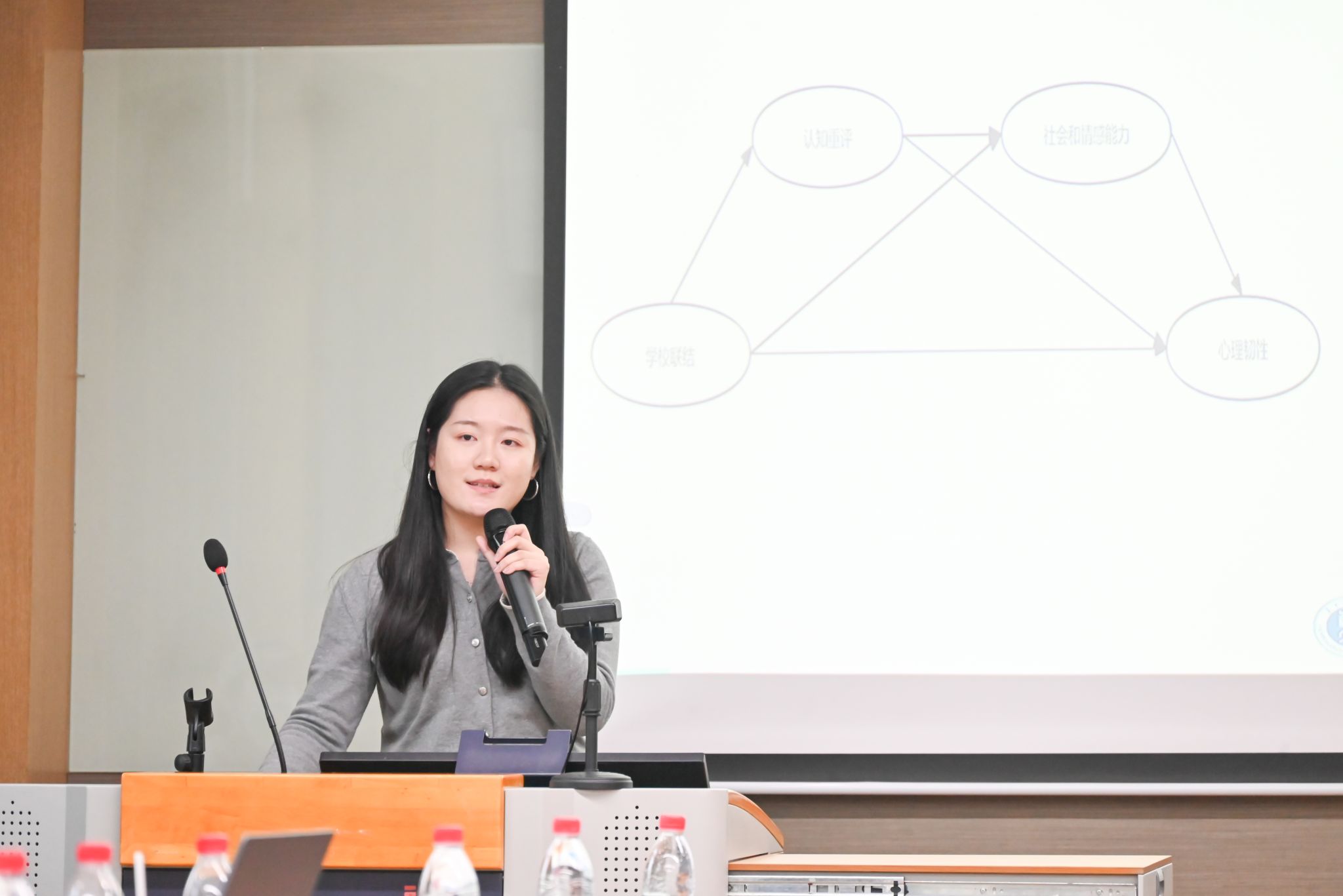 华中师范大学博士生徐芷菡做了题为“‘教联体’建设背景下情感支持与情感能力对班主任心理韧性的影响研究——学校联结、认知重评与社会和情感能力的作用”的报告,认为当前对于班主任心理韧性的研究存在关注不足、情感支持不足以及共同目标的缺失三大问题,通过调查发现了学校联结在其中发挥的直接与间接作用,最终提出了综合性的解决方案。