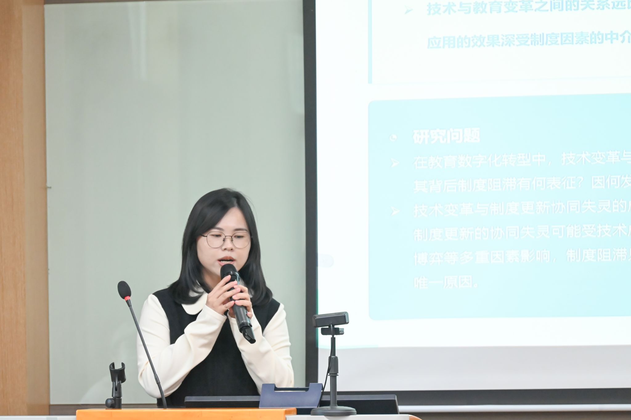 华中师范大学博士生陈珊珊作了题为“技术变革与制度更新:教育数字化转型中制度阻滞研究”的报告。她发现当下教育数字化转型中制度滞后会抑制技术创新,指出了当下教育技术应用与制度存在脱节的核心矛盾,进而阐述了教育数字化转型当中制度阻滞的三重表征以及制度阻滞生发原因的三重根源,最终提出了三条渐进式改革路径。