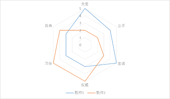 如图1所示,不同的教师具有不同的道德敏感性“雷达图”,雷达图的形态反应了教师在道德内容维度上的敏感性倾向。