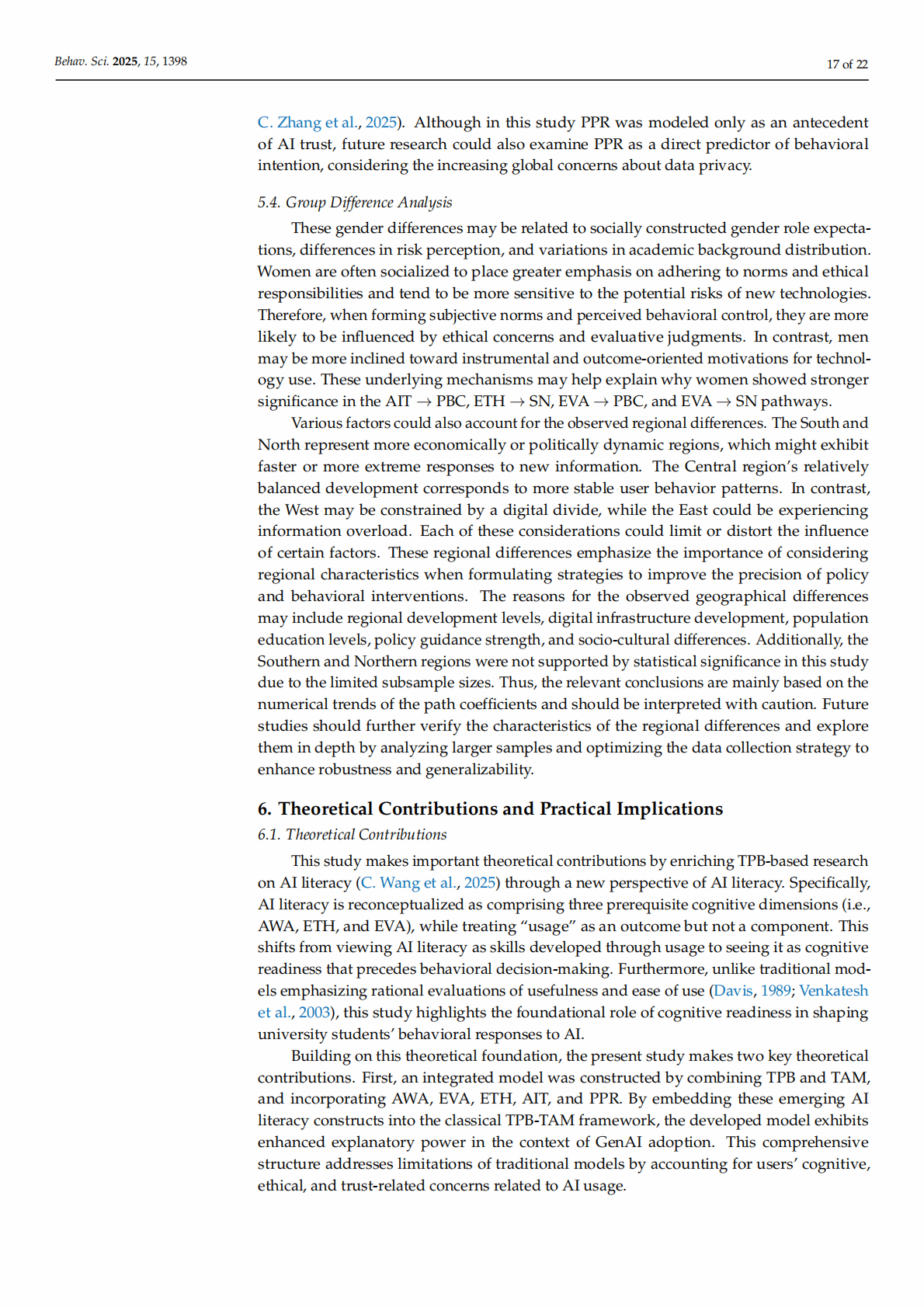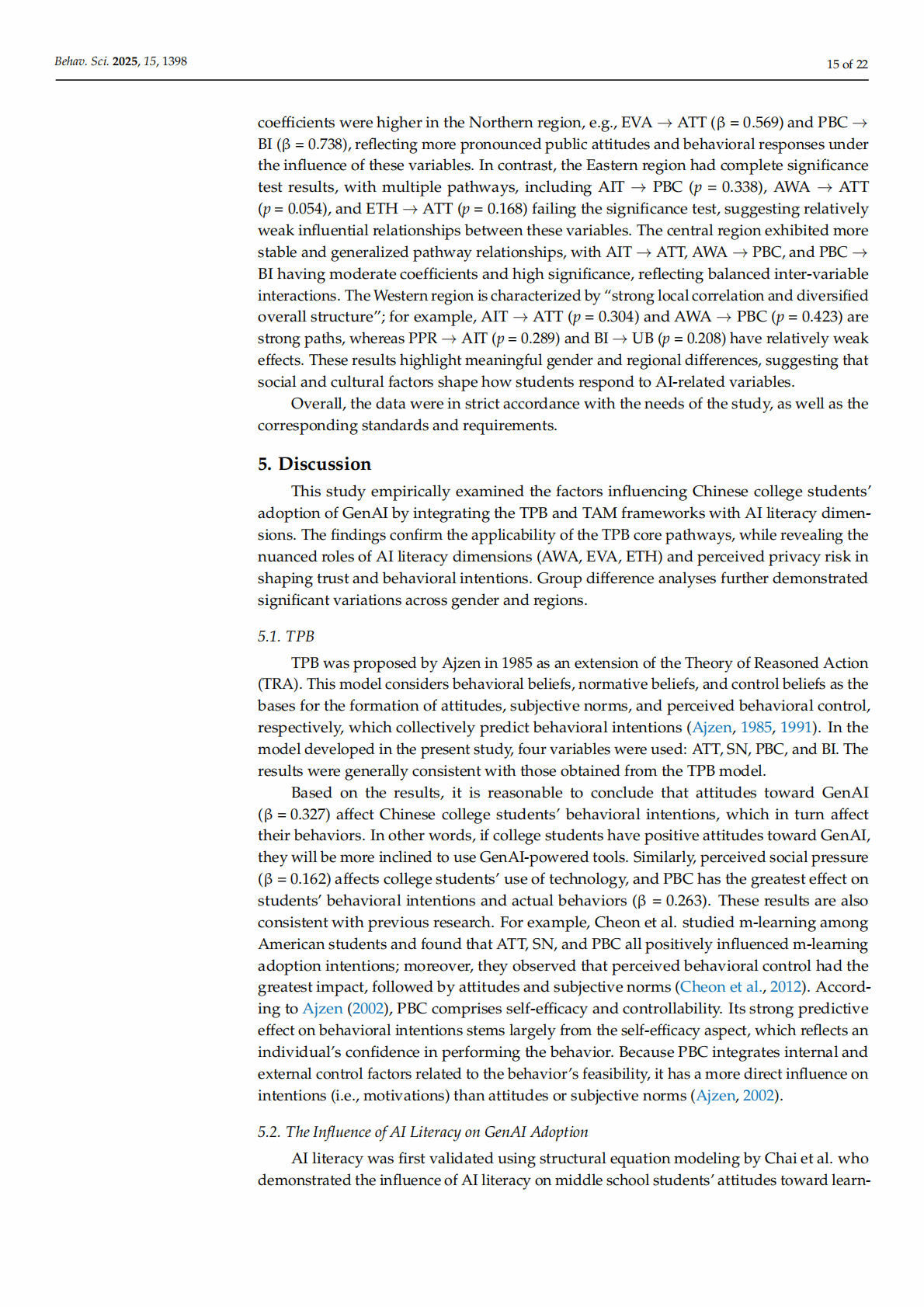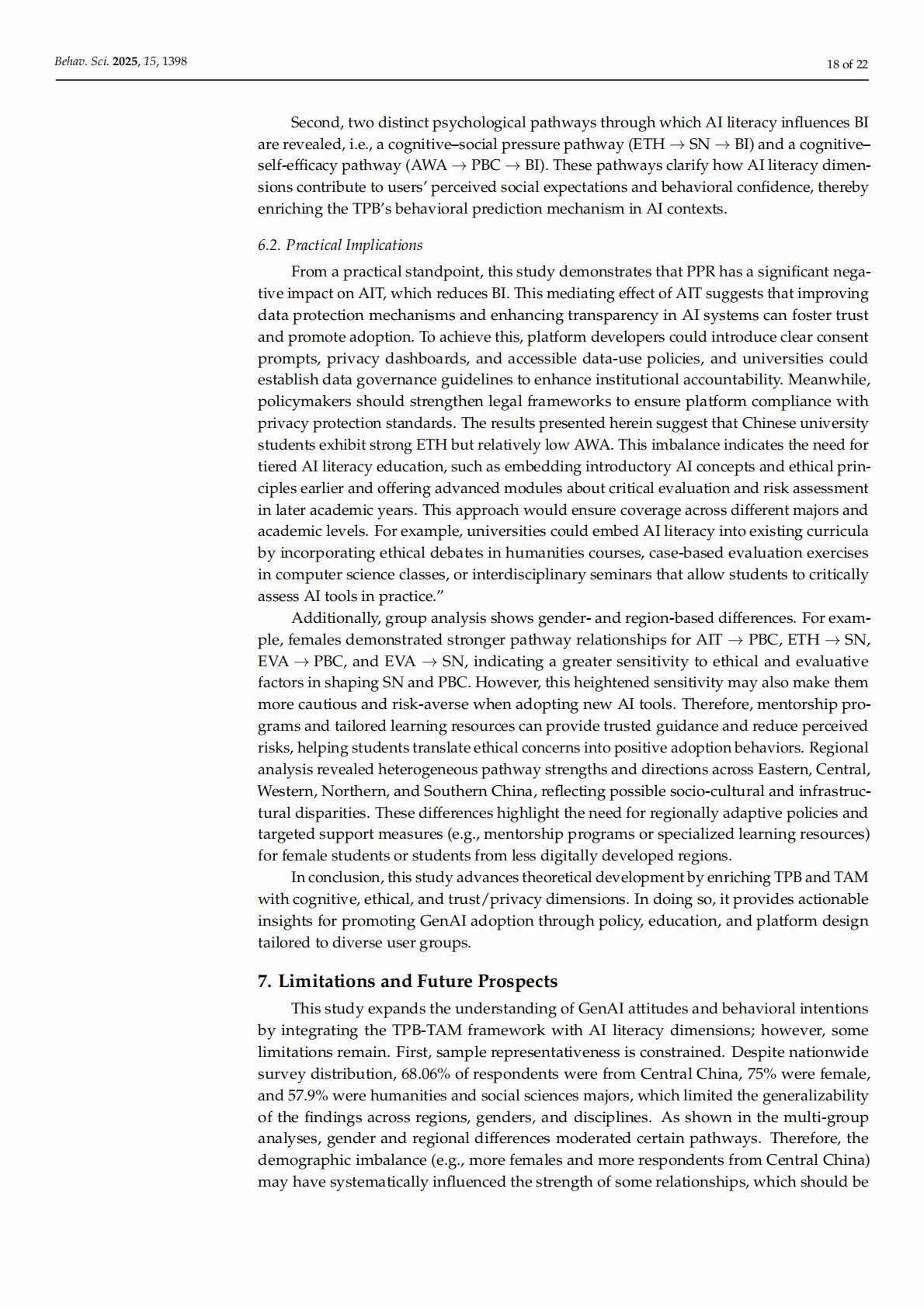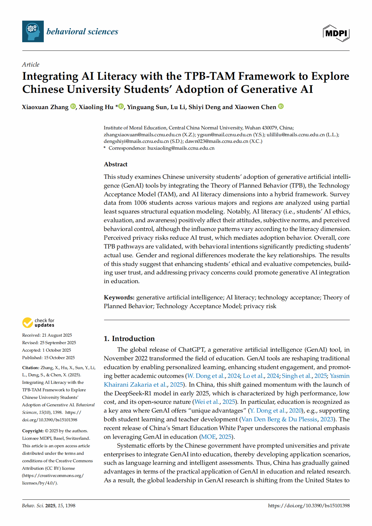 Abstract: This study examines Chinese university students’ adoption of generative artificial intelligence (GenAI) tools by integrating the Theory of Planned Behavior (TPB), the Technology Acceptance Model (TAM), and AI literacy dimensions into a hybrid framework. Survey data from 1006 students across various majors and regions are analyzed using partial least squares structural equation modeling. Notably, AI literacy (i.e., students’ AI ethics, evaluation, and awareness) positively affect their attitudes, subjective norms, and perceived behavioral control, although the influence patterns vary according to the literacy dimension. Perceived privacy risks reduce AI trust, which mediates adoption behavior. Overall, core TPB pathways are validated, with behavioral intentions significantly predicting students’ actual use. Gender and regional differences moderate the key relationships. The results of this study suggest that enhancing students’ ethical and evaluative competencies, building user trust, and addressing privacy concerns could promote generative AI integration in education.