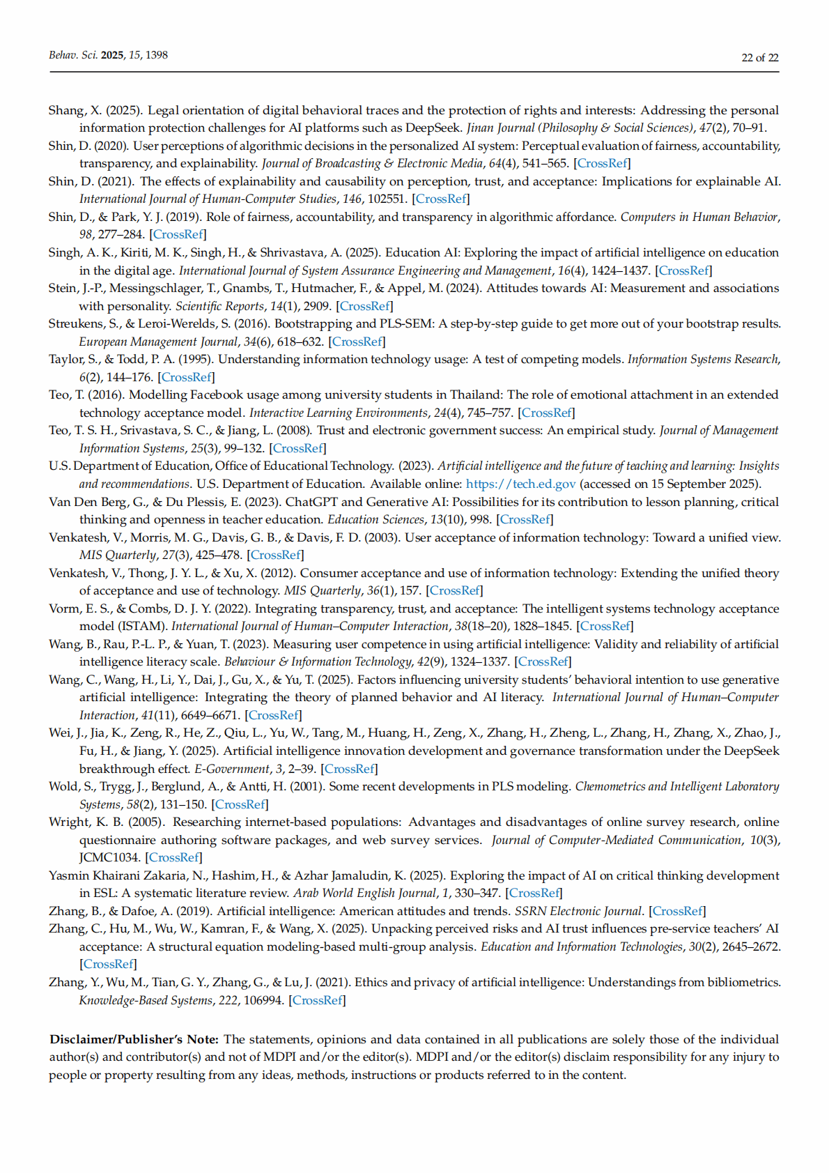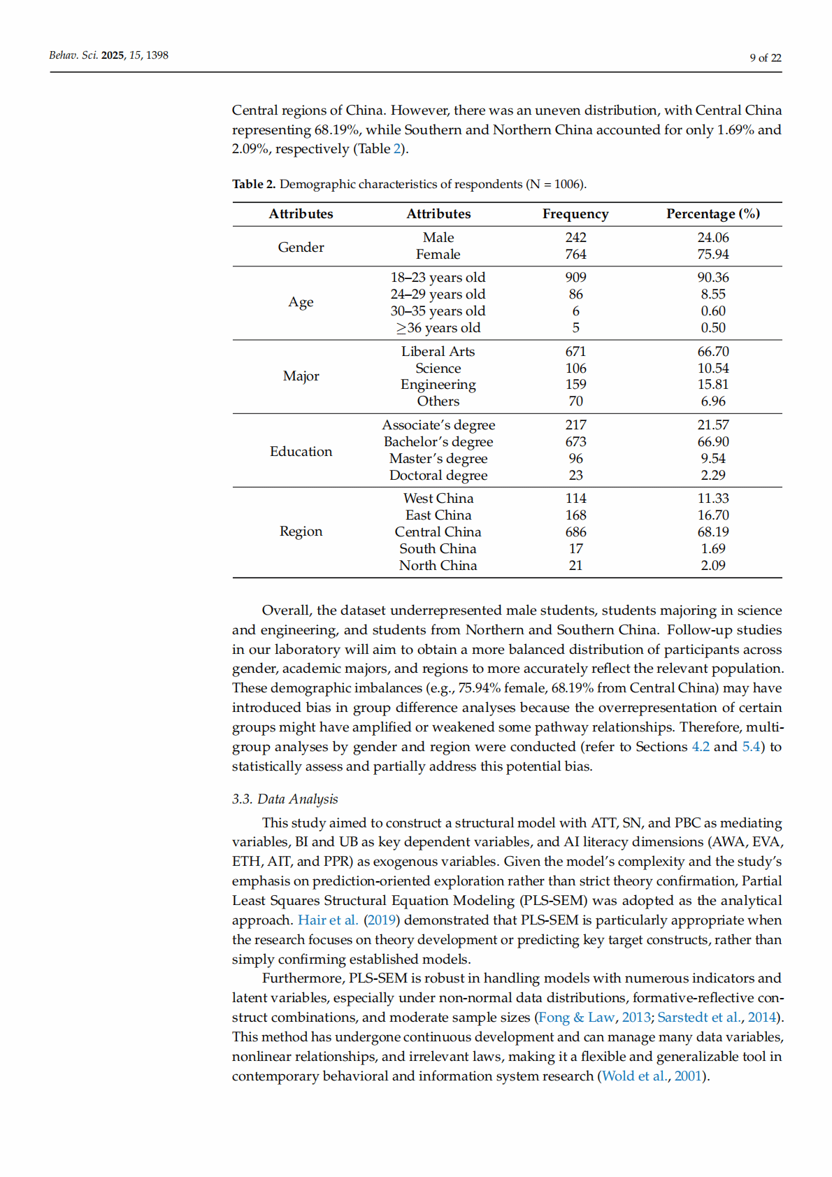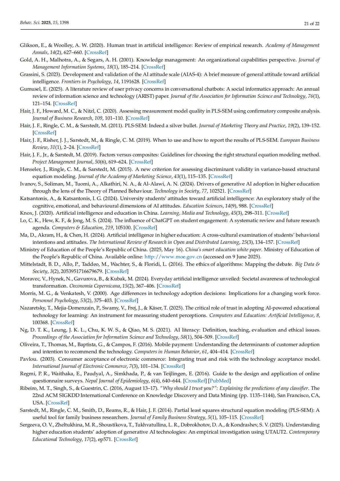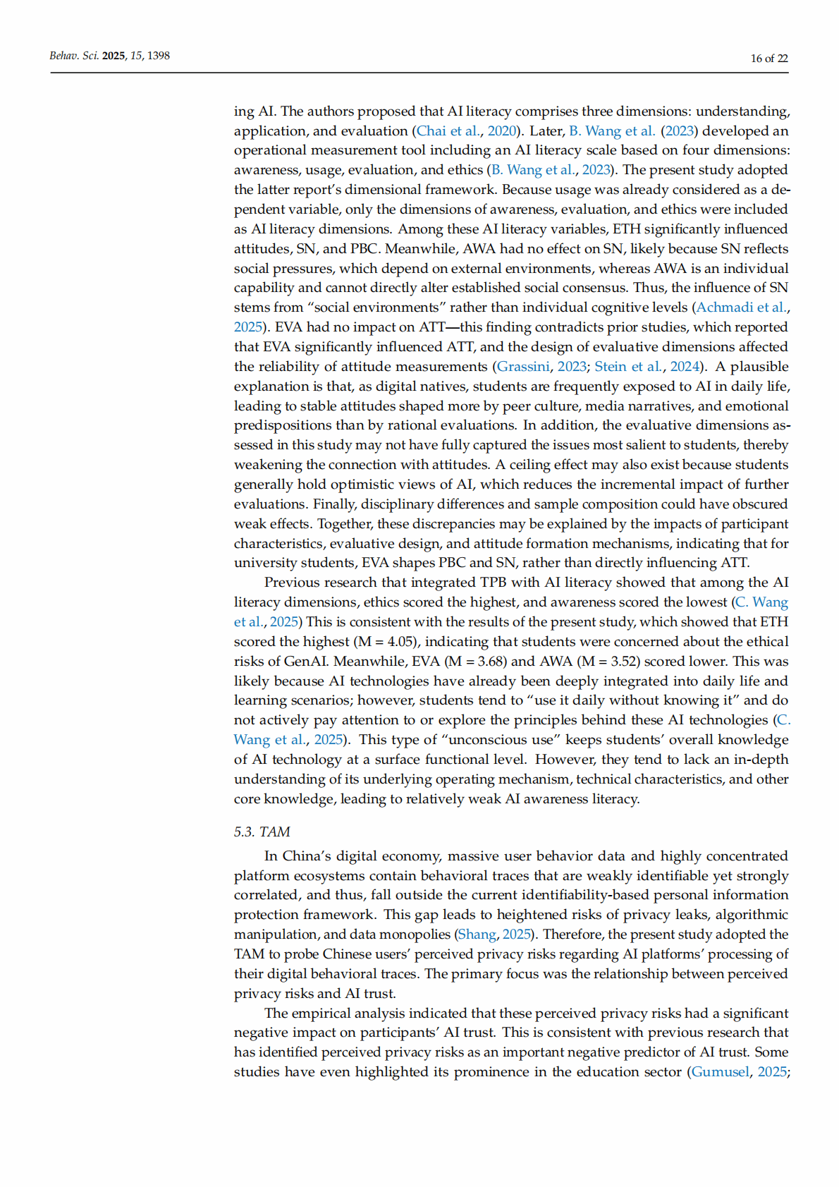 Abstract: This study examines Chinese university students’ adoption of generative artificial intelligence (GenAI) tools by integrating the Theory of Planned Behavior (TPB), the Technology Acceptance Model (TAM), and AI literacy dimensions into a hybrid framework. Survey data from 1006 students across various majors and regions are analyzed using partial least squares structural equation modeling. Notably, AI literacy (i.e., students’ AI ethics, evaluation, and awareness) positively affect their attitudes, subjective norms, and perceived behavioral control, although the influence patterns vary according to the literacy dimension. Perceived privacy risks reduce AI trust, which mediates adoption behavior. Overall, core TPB pathways are validated, with behavioral intentions significantly predicting students’ actual use. Gender and regional differences moderate the key relationships. The results of this study suggest that enhancing students’ ethical and evaluative competencies, building user trust, and addressing privacy concerns could promote generative AI integration in education.