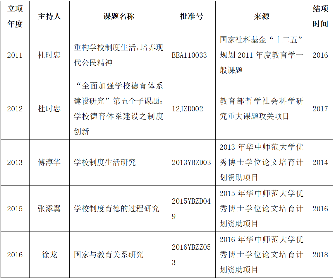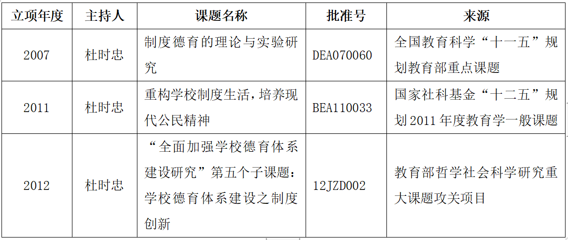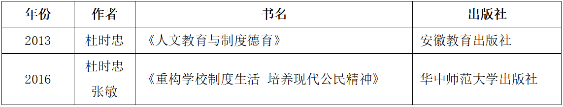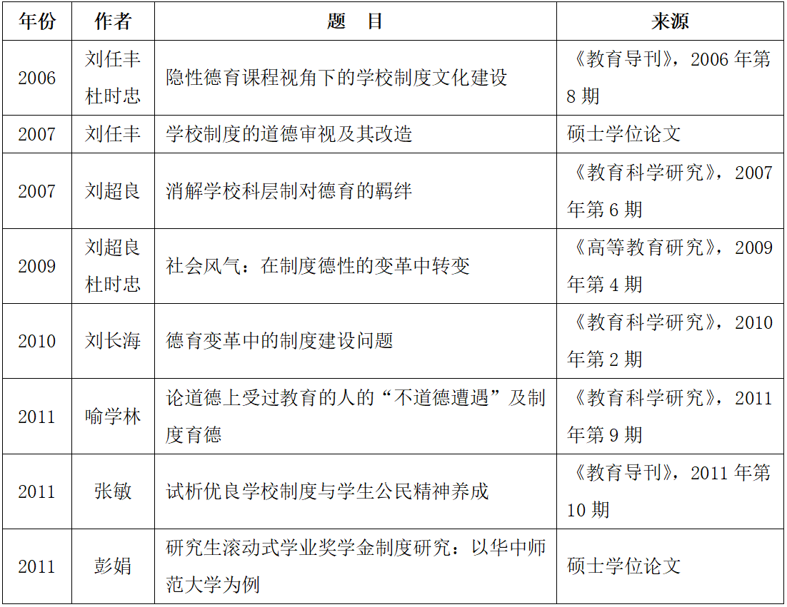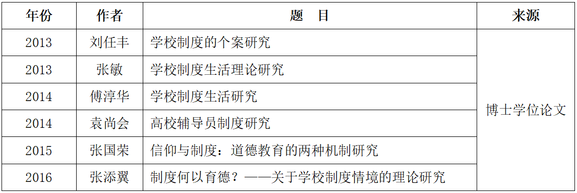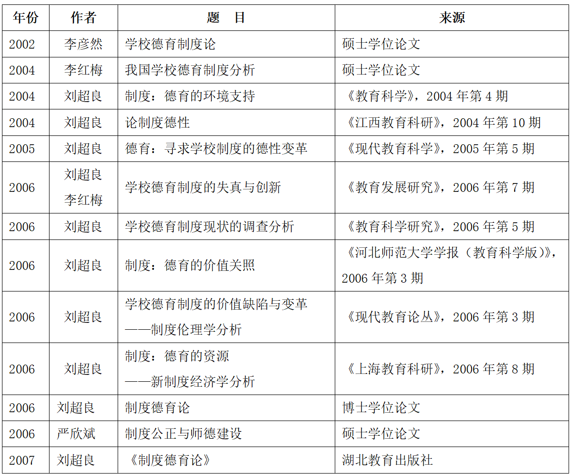 杜老师自己初步探索之后,又接连指导了几位研究生进行了相关的研究(参见表7-2)。其中,尤以刘超良的博士学位论文以及随后出版的专著《制度德育论》最有意义,这也是国内第一本制度德育论方面的专著。从2002年-2006年完成的几篇学位论文,以及刘超良师兄的多篇论文,可以看作是制度德育论幼儿期的表现。