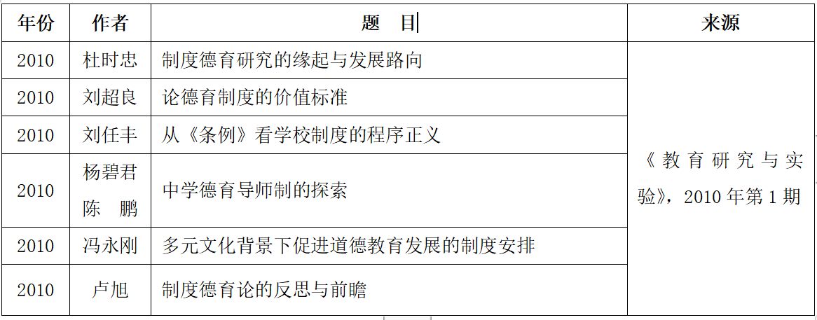如前所述,2007年至2009年的制度德育论研究“有点儿荒”。回应这一时期“论文荒”的表现是,制度德育团队于2010年在《教育研究与实验》上第一次以组稿的方式,刊发了六篇论文(见表7-5)。
