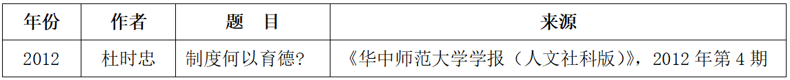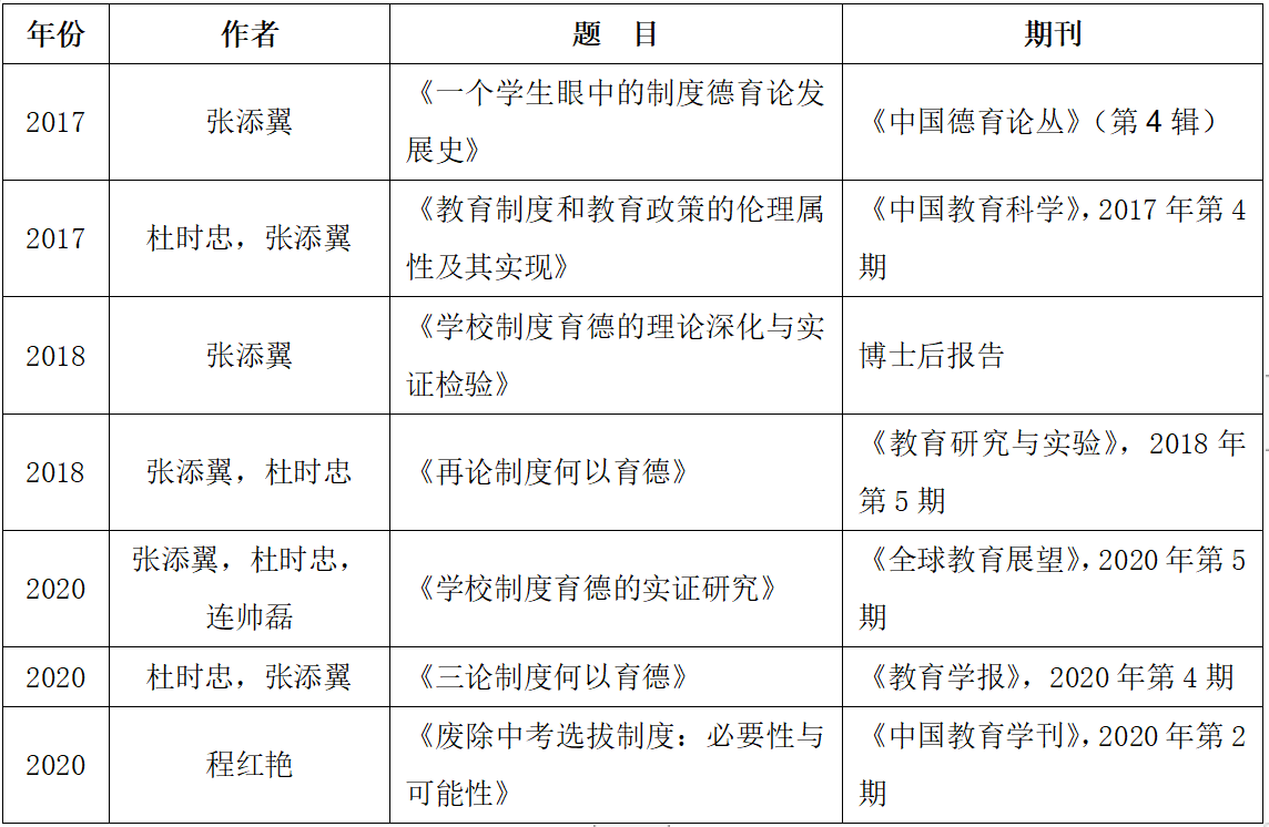 杜老师的《制度德育研究的缘起与发展路向》,“承前启后”的性质从题目中就可以看得出来。在我看来,这一篇论文尤其重要。一方面,提出了很多有待拓展和深入研究的制度德育的领域;另一面,透过这些问题域,以及“发展路向”这个“启后”的半个题目,向我们自己发出了“紧急讯号”。华中科技大学李伟老师在制度德育论青少年期写作的论文(见表7-7),回应了杜老师在这篇论文中指示的信息。我自己也在博士学位论文的开篇,把研究问题和杜老师的这篇论文联系起来。然而,相比于我们,杜老师则早早的进入寻找答案的状态之中了。