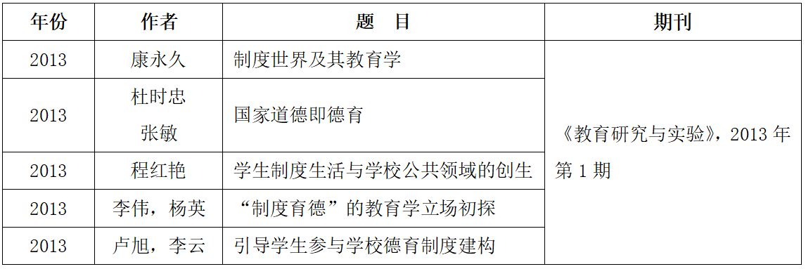 2010年刊发的这一组论文,整体上具有明显的“早期制度德育论”的气质,也就是单一地把“制度”或它的某种属性作为对象进行研究,前者如制度建设、制度环境、德育制度,后者如制度德性、程序正义。制度德育论在这个阶段,还没有关切到与制度相结合的其他对象,还没能关注具有复合性的事物。