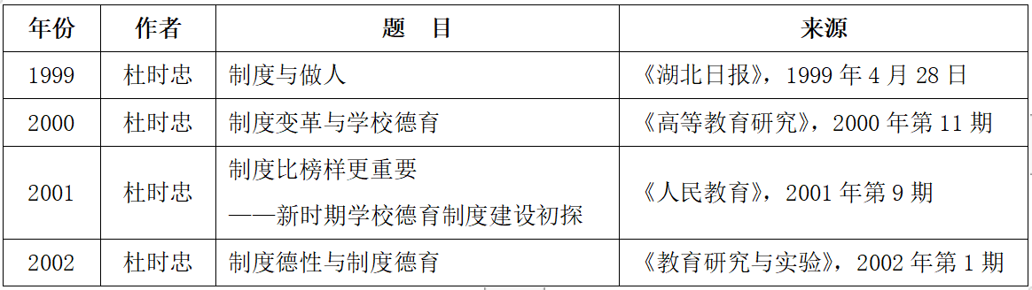 杜老师告诉我们制度德育论研究的起点,是他发表在《湖北日报》(1999年4月28日)的一篇小文章《制度与做人》。在这篇文章之后,杜老师在2000、2001、2002年又先后发表了《制度变革与学校德育》、《制度比榜样更重要——新时期学校德育制度建设初探》、《制度德性与制度德育》三篇学术论文,“较早地阐述了有关学校制度德育的一些构想”。应该说,这几篇论文,代表着制度德育论的“婴儿期”(见表7-1)。