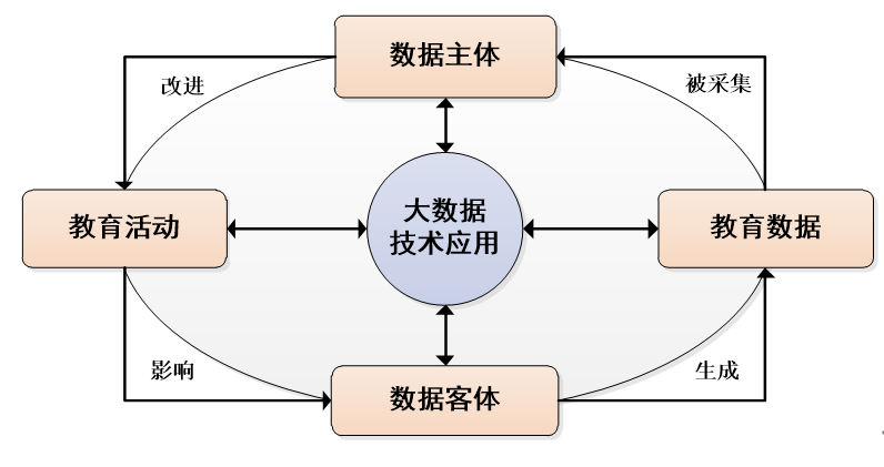 数据主体,是指具备教育大数据相关知识和能力的、参与教育数据采集、储存、分析、决策和应用的技术主体,既包括专家、研究者、应用者等个体主体,也包括专家队伍、研究团队等群体主体;数据客体,是与数据主体相对应的概念,指被数据主体作用的客观对象,即教育大数据这一物化的信息载体。由于能够对教育大数据抽象到“人”的层面,所以,这里的数据客体可以抽象为产生教育数据的人,即教师、学生及其他教育教学相关人员;教育活动是指大数据时代教育教学模式的具体使用过程;教育数据是指通过教育活动而产生的教与学的数据,以及从各式各样数据库中获取的用以分析、管理、评价、预测和决策教育活动的数据。四个要素在“大数据技术应用”的联通下形成教育大数据的结构系统。