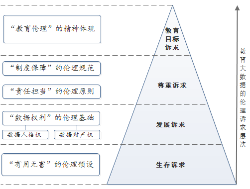 四个方面的内涵表征相互关联,形成从低到高的伦理诉求层级。其中,教育大数据的“有用无害”诉求体现出鲜明的教育伦理色彩,“责任担当”凸显了责任伦理的特征,“数据权利”是权利伦理的内容范畴,“制度保障”则是制度伦理的基本目的。这些伦理内容之间相互交融、彼此交叉,教育伦理中包含了责任、权利、制度等内容,而责任伦理提倡的对教育行为的自律意识和对教育结果的负责精神体现了教育伦理精神,权利伦理指向的教育效益和对应的教育义务也隶属于教育伦理范畴,制度伦理对教育中人的关系的规范和协调决定了教育的基本走向从而保障了教育伦理目标的实现。事实上,伦理学从来都不是封闭固定的知识体系,伴随社会发展而不断涌现的新的伦理问题,需要不同伦理思想的多领域融合应对。教育大数据伦理风险的消解不仅需要教育伦理作为基底和引领,更需要权利伦理、责任伦理和制度伦理的支撑和保障。这些伦理内容彼此依托又相互支撑,共同形成教育大数据的伦理体系。最底层的“生存诉求”反映了“有用无害”的基本需求,是教育大数据得以存在的伦理预设;第二层的“发展诉求”体现了“数据权利”促进教育大数据良性发展的伦理基础;第三层是“尊重诉求”,有了“责任担当”的伦理原则和“制度保障”的伦理规范,才能实现人们对数据主客体的尊重,才能从尊重的角度看待教育大数据的价值与意义;最顶层的“教育目标诉求”则是教育大数据发展的最高境界和终极目标。只有满足生存、发展和尊重的伦理诉求,才能实现教育大数据促进教育目标达成的诉求。(见图2)