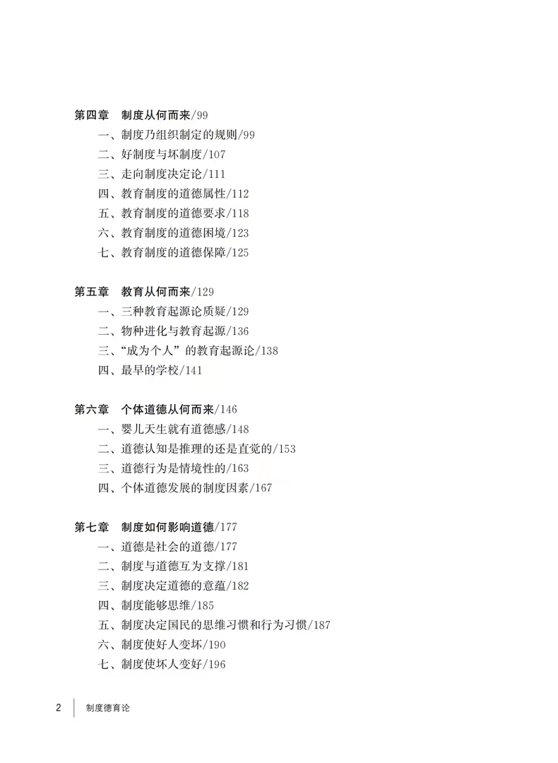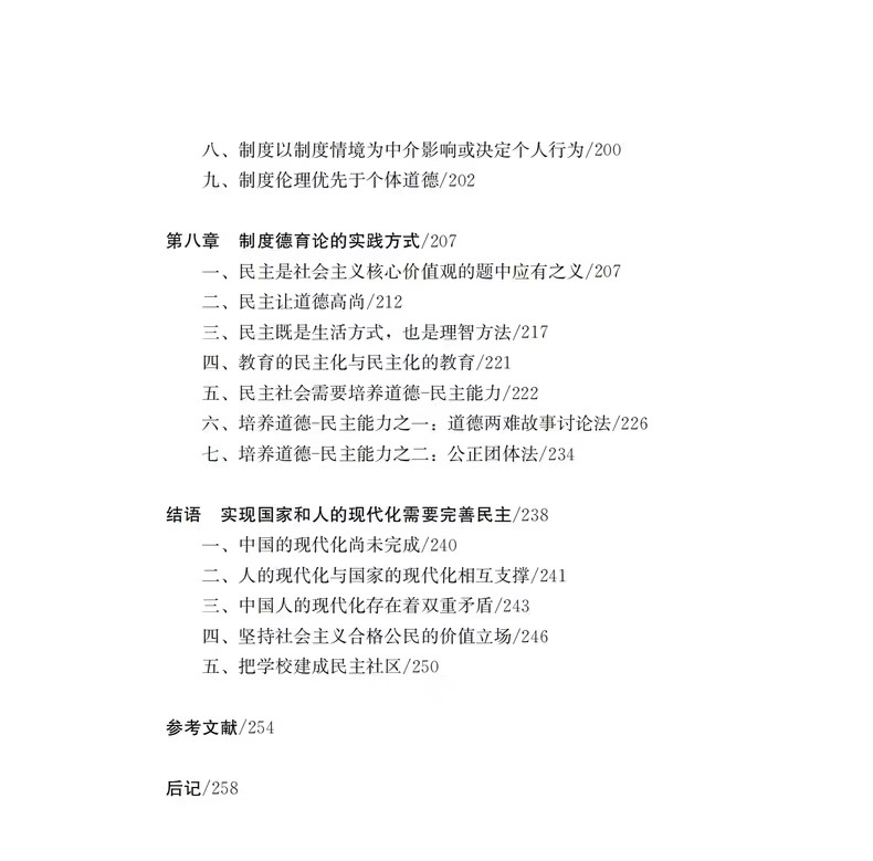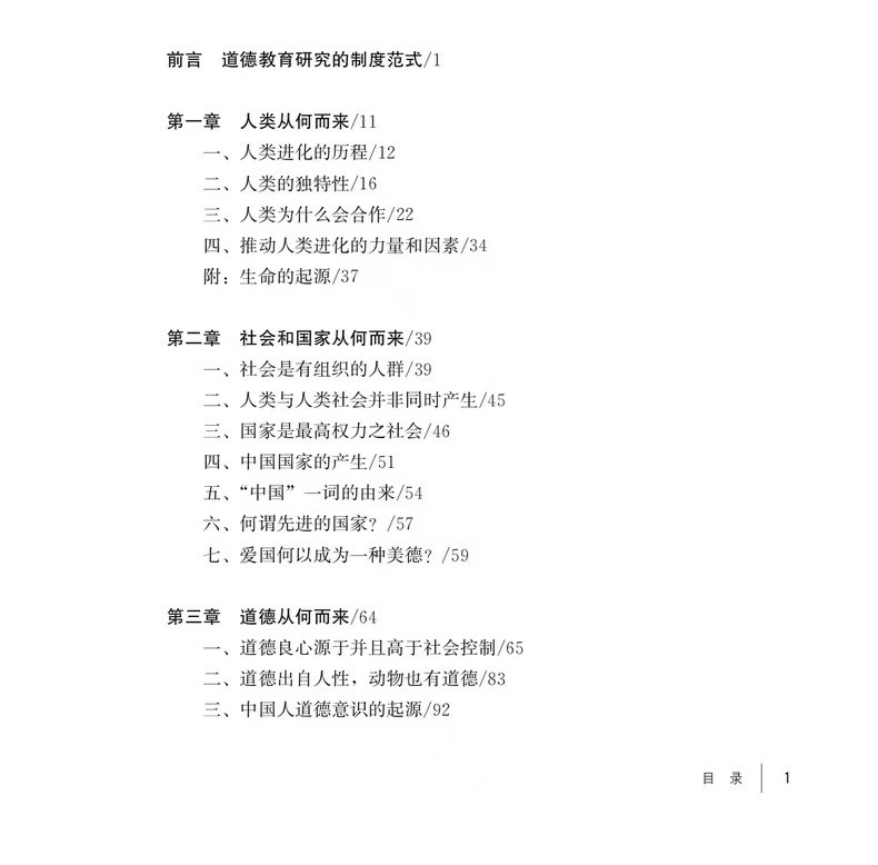 “两千多年前,司马迁在《报任安书》中谈到他编著《史记》的宗旨,概括为三句话,即“究天人之际、通古今之变、成一家之言”。笔者不敢奢望,当然更不可能达到司马迁那样的境界、努力和高度,但是,制度德育论研究确实需要把这三句话作为座右铭,作为永远奋斗的目标。本书尝试回答人类从何而来、国家和社会从何而来、道德从何而来、制度从何而来,尝试探讨人类为什么会合作, 动物有没有道德,人类的天性究竟是什么,等等,就是想“究天人之际” 既想搞清楚“天人相通”“天人合一”也想搞清楚“天人相分”“天人相殊” 。本书力图弄清好制度与坏制度、先进的国家与落后的国家、合作的社会与溃败的社会之差别何在,就是想“通古今之变”,搞清楚决定人类社会自古至今变化、发展的“奥秘”。 对于美德培养,本书的根本立场就是以道德的制度培养道德的人,或者说是以民主制度培养学生的道德-民主能力,以区别于生活德育论、情感德育论等思想主张, 勉强算是追求“成一家之言”的努力。总之,对这三句话,我们虽不能至,但心向往之。”