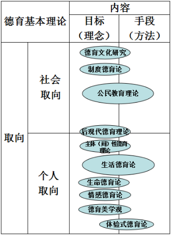 ③ 说明如下:(1)德育理论研究“个人本位”突出,“社会取向”上的探索较少,试图整合个人取向与社会取向的努力则少之又少。(2)公民教育理论和生活德育论堪称当前德育理论研究的主流,在德育目标和手段的探索上均有重大突破。其余的主要德育基本理论则“长于目标建构,拙于手段说明”。(3)当代中国德育理论“主情”,非理性色彩突出,与“主知”(重视学生道德认知能力的培养)色彩浓厚的当代西方德育理论形成鲜明对比。