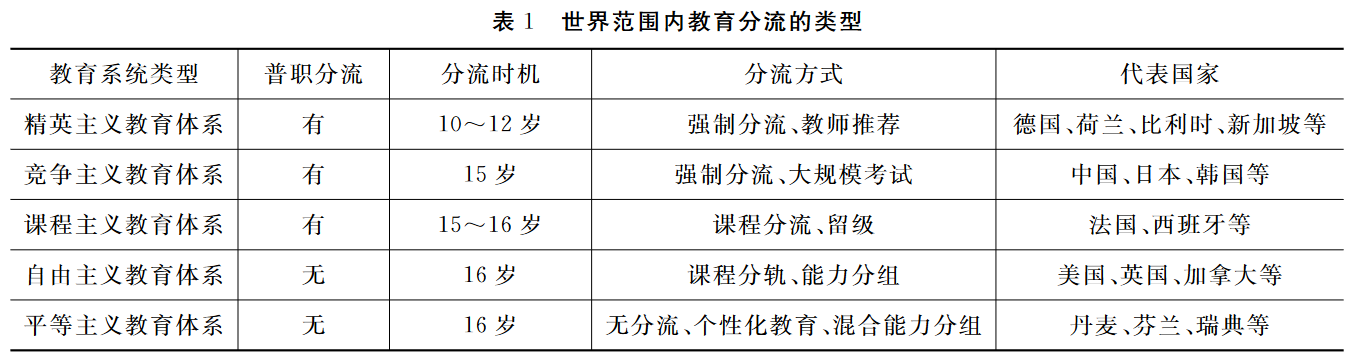 精英主义教育体系、竞争主义教育体系和课程主义教育体系强调能力本位,按照个人能力进行普职分流和学校等级分流,这三种教育体系下的非义务教育阶段校际质量差异较大,教育显著不平等;自由主义教育体系和平等主义教育体系则更强调教育机会均等,不进行普职分流,以校内分流代替校际分流,强调以灵活的教育方式与包容的课程体系去适应学生差异,这两种教育体系下的校际差异相对较小。(见表1)