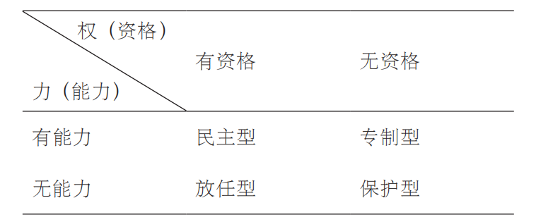 由于在亲子关系中,父母一般是强势的一方,且有制度和文化的保障,其他人(包括儿童在内)一般不会质疑父母指导儿童的“资格”和“能力”,所以评判的焦点主要集中在儿童,即父母对儿童行动资格与能力的评判。本研究根据“权”与“力”两个维度,以“有、无”的简单判断作为区分,划分出四种类型的亲子关系,以及相应的家庭教养方式(见表1)。