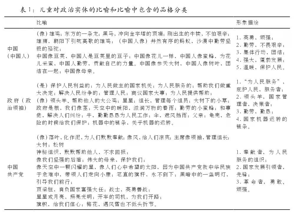 依据政治启蒙的三个维度,笔者自主设计了调查问卷,并对武汉市三个区县的11所中、小学校四年级到八年级学段学生展开调查(考虑到小学三年级以下儿童文字阅读理解能力有限,故选取四到八年级儿童为研究对象)。调研以班级为单位进行整群抽样,共发放问卷1600份,回收问卷1560份。调查研究发现,儿童政治知识的掌握情况较好(均值0.7),95.4%的儿童政治认知水平处于中高水平。如被问及“国家主席是如何产生的”,80.6%的儿童选择“全国人大代表选举产生”。又如“《中华人民共和国宪法》由谁制定”这一题项中,71.3%的儿童选择“由全国人民代表大会代表人民制定”,说明儿童对我国政治制度有一定了解。儿童对抽象的政党和政府则表现为认识模糊,“只是听过,但具体不知道是什么”。对政党的认知主要表现为对具体的共产党员的认知,如“雷锋”“毛爷爷”等,并认为共产党员“更有奉献精神”“是好人”,具有伊斯顿所说的“人格化”和“理想化”特征。笔者进一步收集归纳儿童对于政治实体的比喻,结果如表1所示。