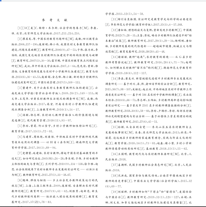 如前备述,乡村教师领域存在着研究取向 “浪漫化”、研究视域“褊狭化”、研究立场“本土化”的缺憾,而这在一定程度上可归因于理论研究过程本身的不完善甚至不合理、不规范。反言之,倘若理论研究足够扎实,不仅能给人以启示,也能促进实践活动的合理展开。鉴于此,推动乡村教师研究的规范与反思正当其时甚或迫在眉睫。具而言之,首先,应提升文献综述的意识。就笔者目力所及,绝大多数乡村教师思辨研究的成果,都缺少文献综述的部分,“鲜有系统梳理和回顾同行在相同问题上的研究工作,很少分析同行所作出的贡献和存在的问题”[43],由此我们难以直接了解此类研究较之于前人成果的创新之处。不过,倘若我们认真梳理的话,可以发现某些成果或许也确实没有创获之举。或言之,一些学者都是在重复一些已经尽人皆知、近乎常识的观点。在此情况下,乡村教师研究领域知识的有效增长和新陈代谢无从谈起。鉴于此,有必要强调文献综述在乡村教师研究中的重要性。权威杂志《教育研究》发表启事,指出“文献综述反映了研究的逻辑起点,也反映了研究者的学术素养和学术规范自觉”[44],也足以为我们所鉴。