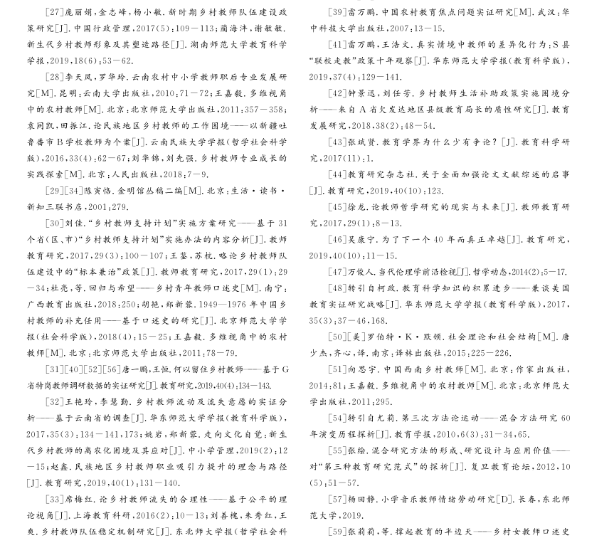 其次,适时运用量化与质性混合的方法。当前乡村教师研究领域,量化研究和质性研究都有学者涉猎, 但成果数量都还比较少,而将二者混合使用的成果更是寥若晨星。考虑到量化研究和质性研究虽各有所 长,但也各有所短,而此短恰好可为彼长所补。所以乡村教师研究领域有必要采用“质”“量”混合的方法。就具体的研究步骤而言,不外乎以下方面:(1)确定研究问题;(2)确定混合是否合适;(3)选择合适的混合策略;(4)收集、分析、解释资料;(5)使数据合法化;(6)撰写研究报告。[54]在此需要言明的是,考虑到混合研究难度较大,所以乡村教师研究领域混合方法的运用不能 “强求”,而应“巧取”。可行的途径即是:采取类似于 “顺序解说型设计”的思路,在量化研究的结论有所局限时,可适当开展质性研究,对结论进行补充(先“量” 后“质”);抑或是采取近似于“顺序探究型设计”的思 路,在质性研究的结论不够完善时,可适当开展定量研究,对结论进行拓展(先“质”后“量”)。[55]就前者而言,唐一鹏和王恒的研究可资为鉴:研究者“利用 D 镇教育部门的数据对特岗教师留任的影响因素进行分析,虽然留任模型的分析尽可能考虑到了不同类型因素所造成的影响,但仍然有很多隐形的力量(如制度、财政、文化等)无法明确纳入模型。为此,下面我们结合实地调研的结果,对影响特岗教师留任的其他因素进行补充分析”。[56]就后者而言,杨田静的研究可供参考:研究者 “首先使用质性研究对小学音乐教师情绪劳动在课堂上、课堂下不同工作情境中的情绪表达进行观察和访谈,分析其情绪表达特征,考察其对情绪劳动各维度内容的理解。结合质性研究的结果通过对以往研究的梳理和相关理论分析,确定问卷调查的内容和维度,通过大样本的调查,了解小学音乐教师情绪劳动的整体特征,并结合访谈进一步确定影响其情绪劳动的主要因素”[57]。