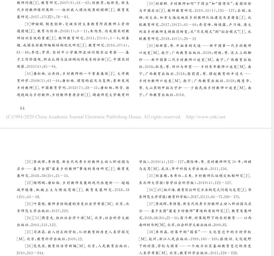 由上观之,乡村教师研究领域出现了“不大不小”的问题:上位的整体研究体系性不是很强,“以小”并未 “见大”;下位的具体研究也不是十分具体,“以小”也未 “见小”。究其缘由,研究方法的疏漏难辞其咎。申而论之,采取传统理论思辨的方法来研究乡村教师问题 的成果比比皆是。如有学者指出,在现代文明中,教师远离了乡土文化,从而导致其专业性和公共性的沦落, 从而被贴上“低素质”的标签。[10]客观而言,学者们的理论思辨不无启发,如唐松林的系列研究就对乡村教师 “低素质论”进行了有力地辩驳;但受制于研究“停留在主观性的思辨和应然性的畅想阶段”[11],学者们并不熟谙历史和现实中一些有关乡村教师的实情,所以其理论推演的观点可能在一定程度上脱离实际。譬如“乡村教师有一种使自己回归自然、享受乡土生活状态的潜在心理倾向”“改善乡村教师的条件和待遇是‘标’,形成乡村教师的职业认同感才是‘本’”“乡村教师有着一种自由、自然的灵性,它既向宇宙万物敞开,也需要宇宙万物的滋养,由此变得博大精深、独立自律、包容无垠”[12]等总体性的观点便与某些乡村教师因生存环境艰苦和物质条件匮乏而逃离乡村的具体事实[13]相去甚远。进言之,倘若我们多深入实践,掌握一些实情, 则势必能更加审慎地给出结论。当然,我们也不妨适度参考下已有的基于实证、历史和比较方法研究乡村 教师的成果,则或许也会更加谨严地展开论述。
