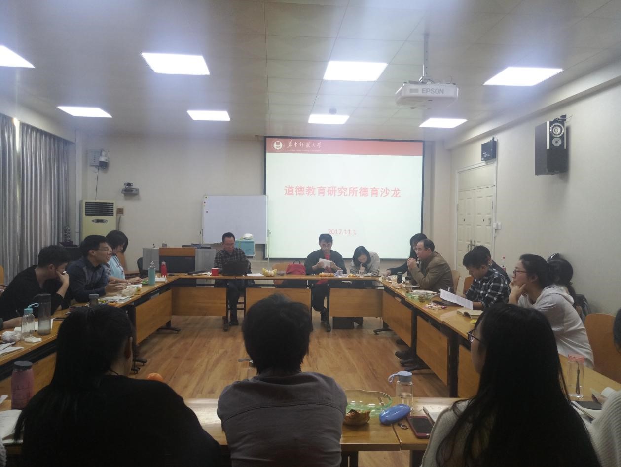 2017年11月1日下午,华中师范大学道德教育研究所2017-2018学年第七期学术沙龙在田家炳502室顺利举办。本次沙龙以“回顾与前行——德育所师生期中小结”为主题,德育所硕博研究生就近半学期的学术研究情况和问题进行了汇报交流。杜时忠教授、程红艳教授、卢旭副教授以及德育所硕博研究生参加了此次沙龙。本次沙龙由硕士生李家琪主持。