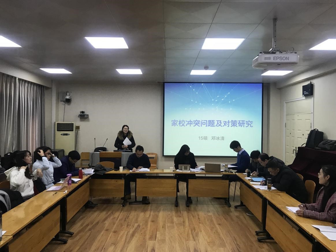 沙龙的第一个环节,由研三硕士生进行毕业论文汇报。邓冰清对其毕业论文《家校冲突问题及对策研究》进行介绍,并指出当前论文存在的问题,归因分析没有理论视角,希望得到进一步指导。黄凯芸阐述了论文《教师科研共同体的构建——基于L的叙事研究》的写作思路,并指出了自身的不足及展望。郭微微在汇报论文《论王阳明“良知”论视域下学生良知的构建》中,着重介绍了“良知隐匿”、“良知与良心”的概念界定。