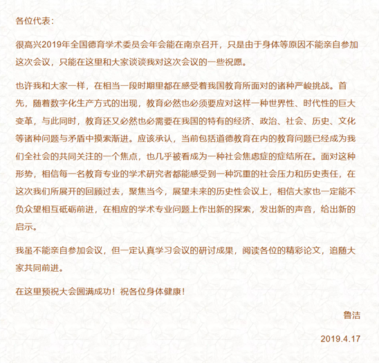 南京师范大学道德教育研究所所长冯建军教授宣读了鲁洁先生的寄语,鲁洁先生指出,新时代背景下我国教育面临新的挑战,希望每位教育研究工作者都能不负众望、砥砺前行,在相应的学术专业问题上作出新的探索、发出新的声音、给出新的启示。
