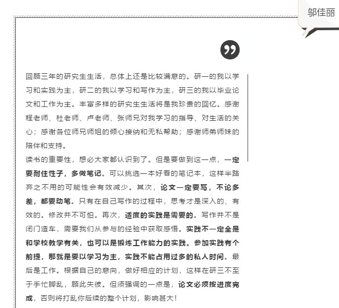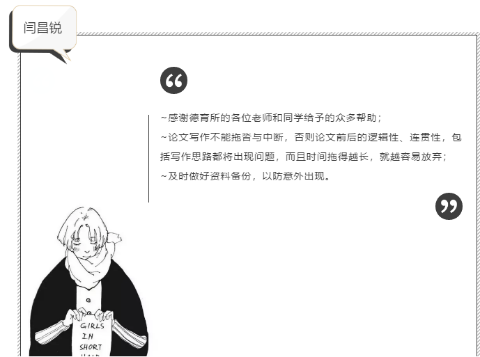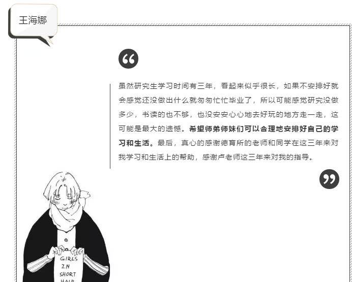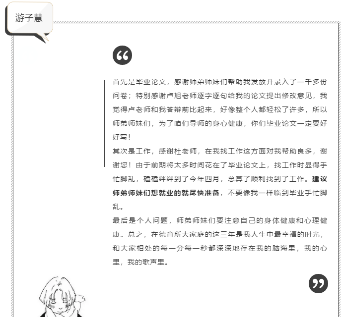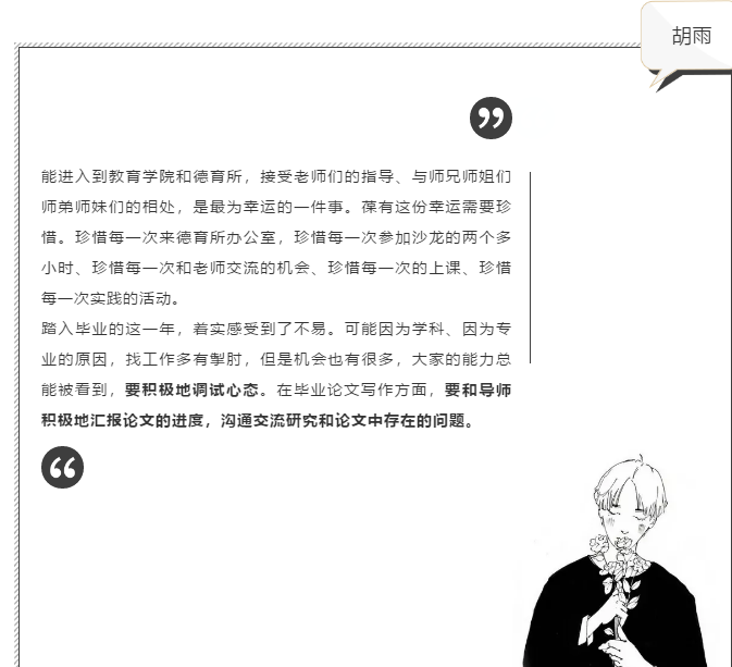 参加沙龙的9位硕博毕业生基于自身经历与学习期间的所感所悟,向德育所的老师和同学们表达了由衷的感谢,同时也向大家分享了自己这些年来所积累的经验。