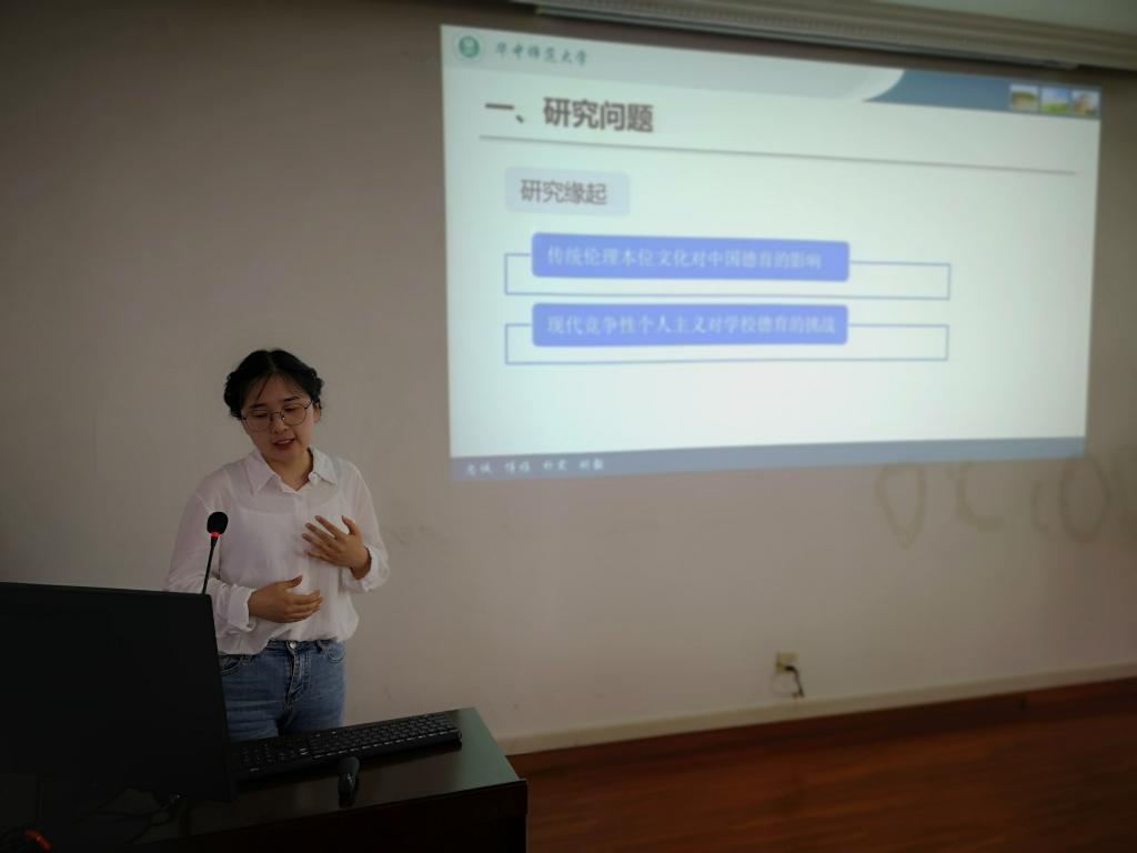 孙永敏博士的论文题目为《社会本位德育的现实困境及其超越》。她分别从研究问题、研究思路、研究方法、研究内容及研究反思五方面进行答辩。答辩委员会认为,论文选题具有一定的理论价值及实践意义,该研究梳理了社会本位德育思想的历史脉络,并结合现实说明了该德育思想的困境。该研究力图通过建构共同体实现对社会本位德育思想的超越,具有一定的可行性,但仍需进一步探讨与社会本位相关的概念性知识以及共同体的作用机制。