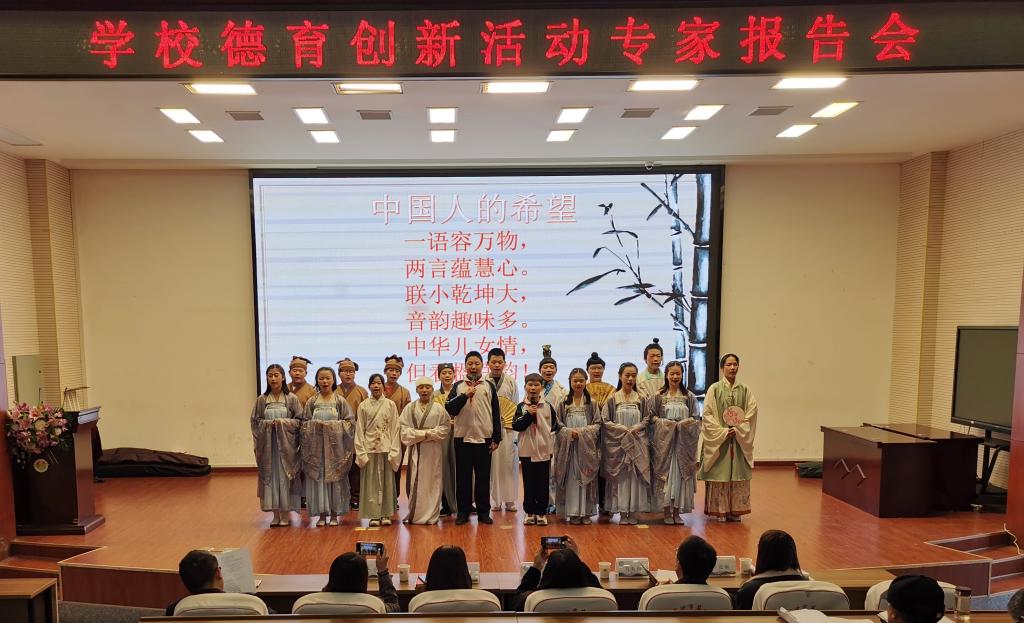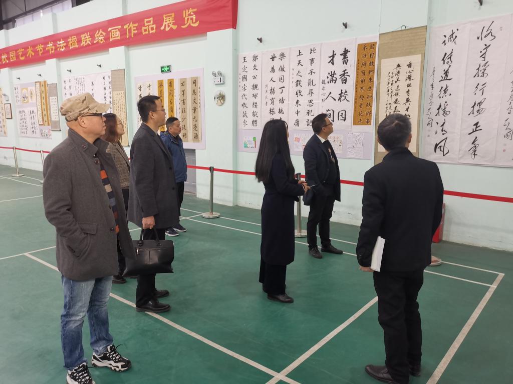 首先,雷波校长、刘小青校长以及其他校领导陪同专家组参观了学校组织的“校园艺术节书法楹联绘画作品展览”,阅览师生书法风采;随后,专家组与学校书法教师、书法家石人國先生交流洽谈,领略毛体书法的魅力;之后,刘宏广主任主讲的以小组比赛为媒介,由赛背、赛说、赛评、赛品等多个环节组成的楹联课,课堂生动又富有活力、循循善诱、层层深入地将楹联知识传达至学生,给专家组留下深刻印象;专家组一行还参观了学校的智能化思政教室,学习了独具本校特色的德育校本教材《浓缩的党史 带韵的宣言》,欣赏了学生组织的《楹联韵 中华情》舞台剧。