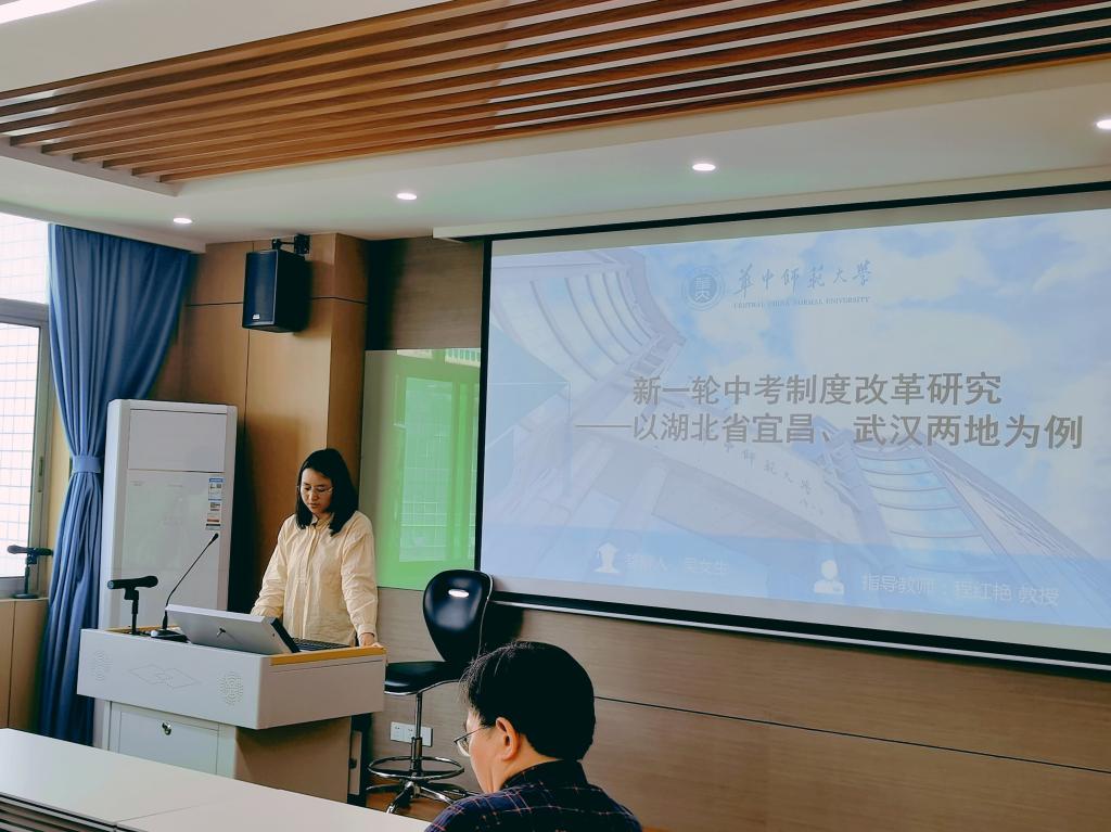 吴女生以《新一轮中考制度改革研究》为题,从选题目的和意义,研究方法和过程,研究内容以及总结不足四个方面介绍了自己的论文。张添翼副教授建议进一步充实挑选两市进行研究的理由,小标题需更加具体些。卢旭副教授指出,中考制度问题的根源在于高考制度,因此建议文章中要涉及到高考制度的相关内容。