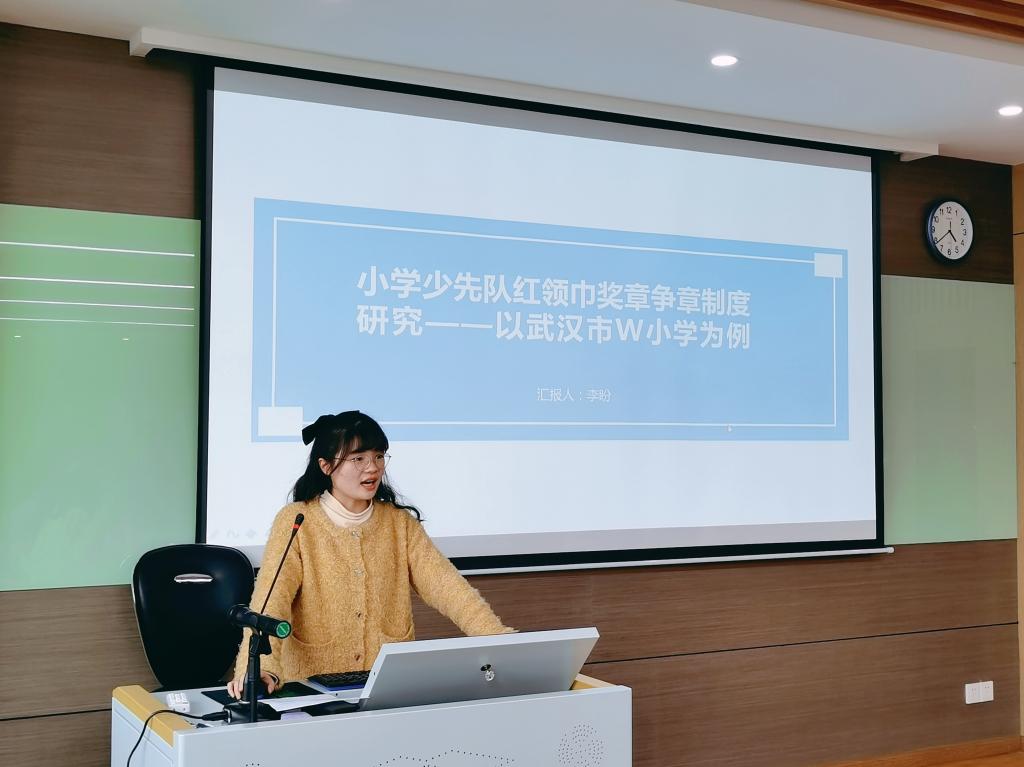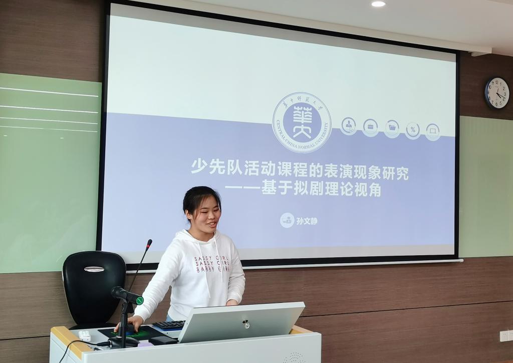 孙文静以《少先队活动课程的表演现象研究——基于戈夫曼拟剧理论视角》为题,分析少先队活动课程的时空结构、表演的过程特征以及存在的问题及优化。张添翼副教授建议文献综述部分着重从理论视角方面论述,并调整论文标题。程红艳教授建议厘清虚假表演与真实表演的区别。