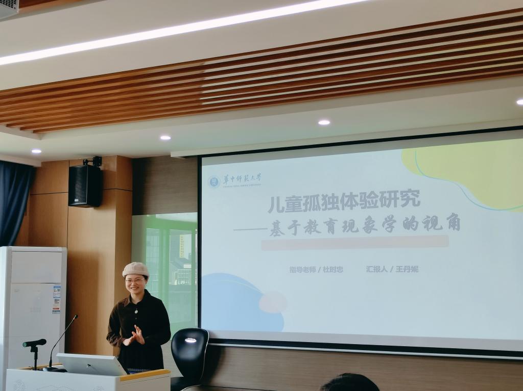 王丹妮以《儿童孤独体验研究——基于教育现象学的视角》为题,通过对孤独的描述体验、探视以及儿童孤独现象对教育的启发等方面阐述。张添翼副教授建议按照学术思路去论述。程红艳教授指出,文献综述需更加丰富,建议对孤独的实质进行分类以扩展孤独的核心概念、孤独的类型等。
