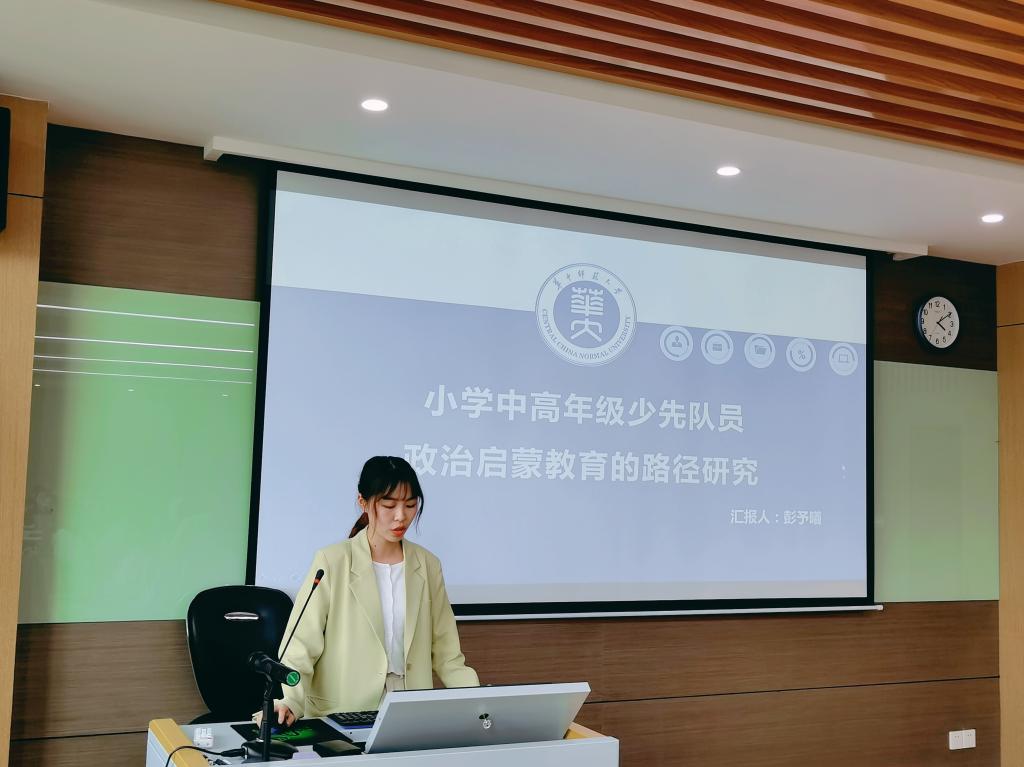 彭予曦以《小学中高年级少先队员政治启蒙教育的路径研究》为题,对儿童政治启蒙进行调查和分析以提出路径。张添翼副教授建议将核心概念厘清,扩大研究对象的数量。卢旭副教授认为需进一步明晰政治启蒙教育多种路径之间的关系。程红艳教授建议添加政治启蒙的内涵这一部分。