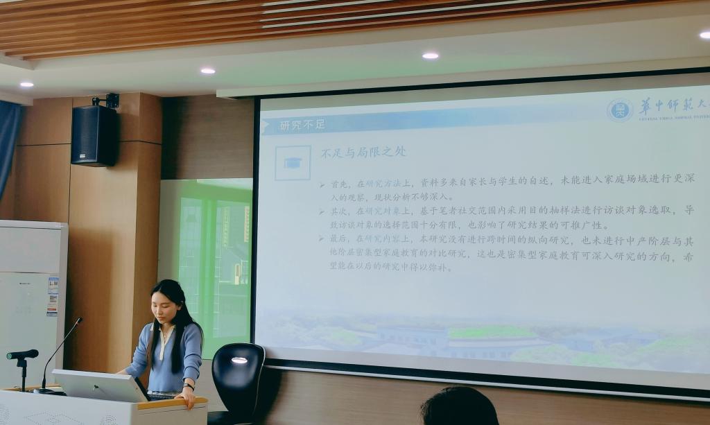 易欢欢汇报的论文题目为《密集型家庭教育方式的现实困境与改进策略》。她运用质性研究方法分析中国家庭教育现状,从概念界定、现状分析、原因透视以及结论与对策方面阐述。张添翼副教授认为文章概念界定比较薄弱,建议做相应的概念辨析。卢旭副教授强调量表测量的分类标准放到研究方法处。