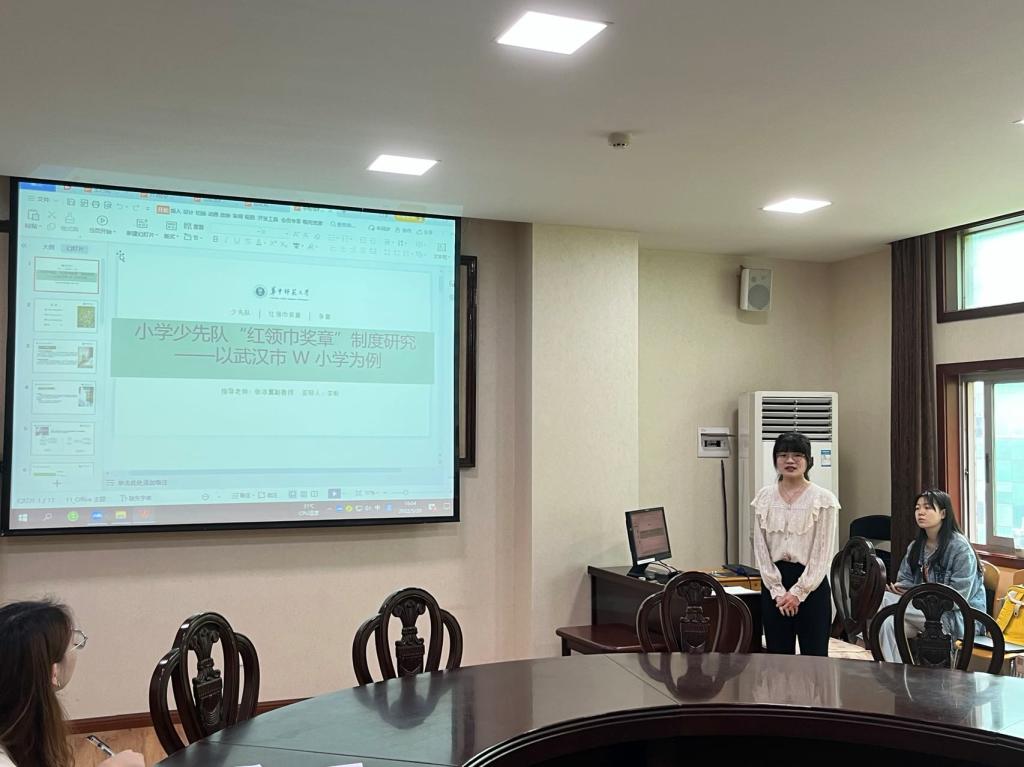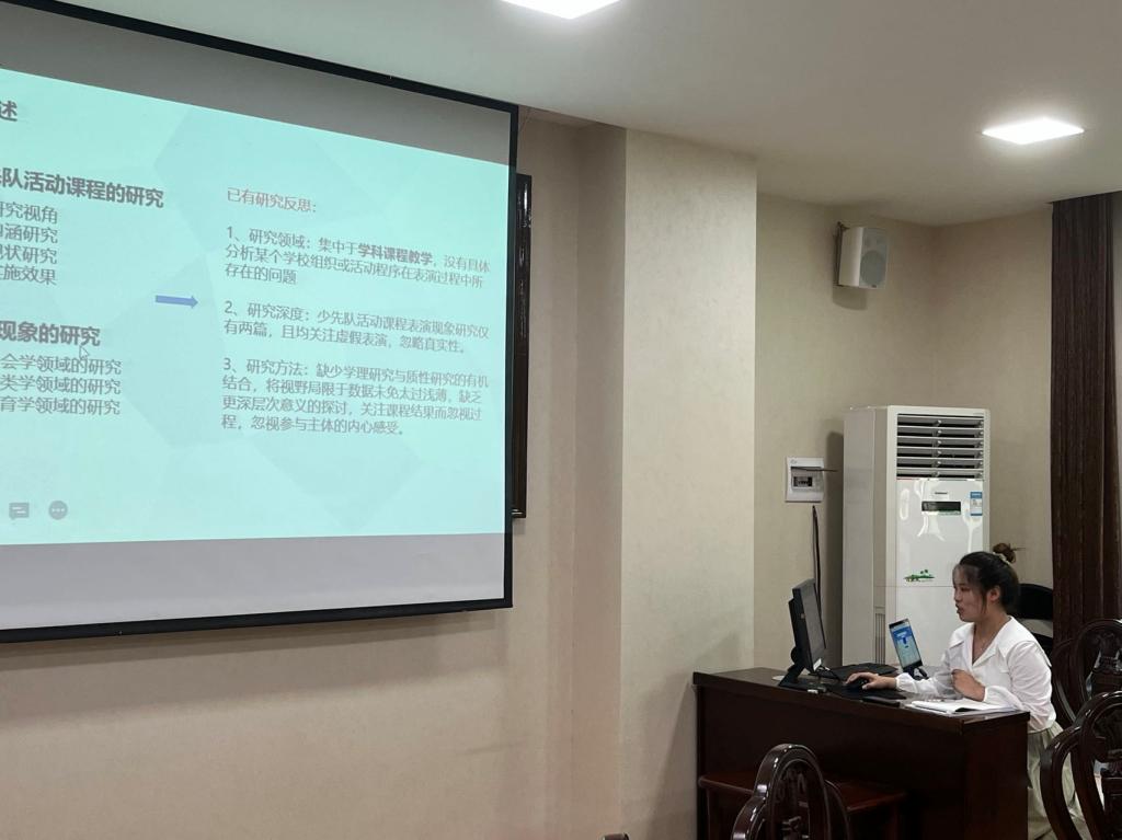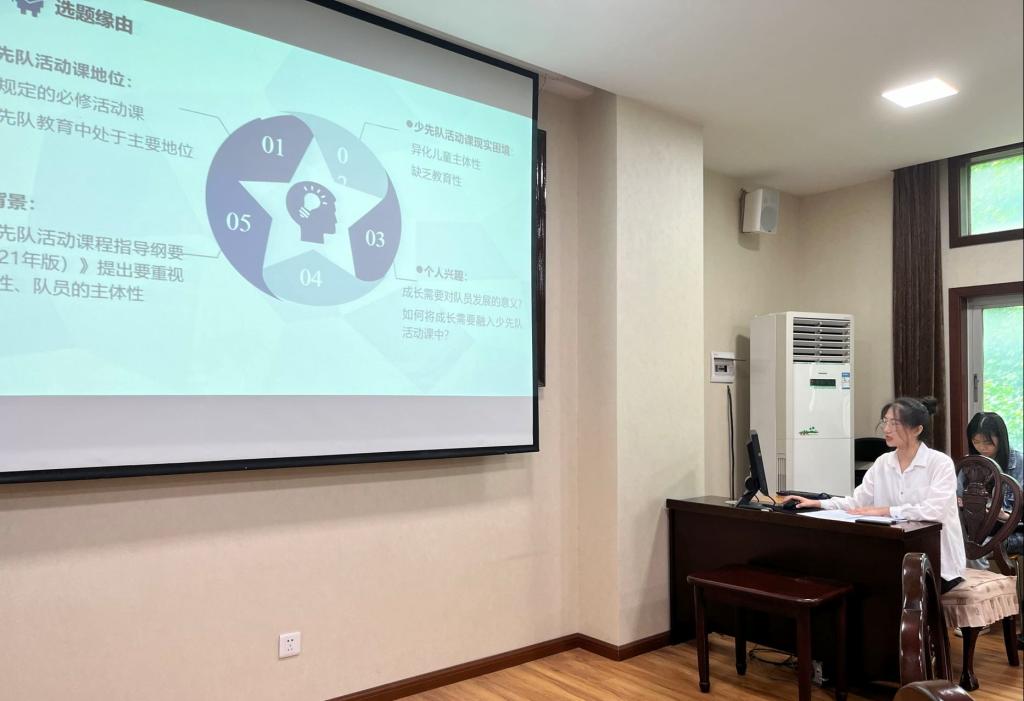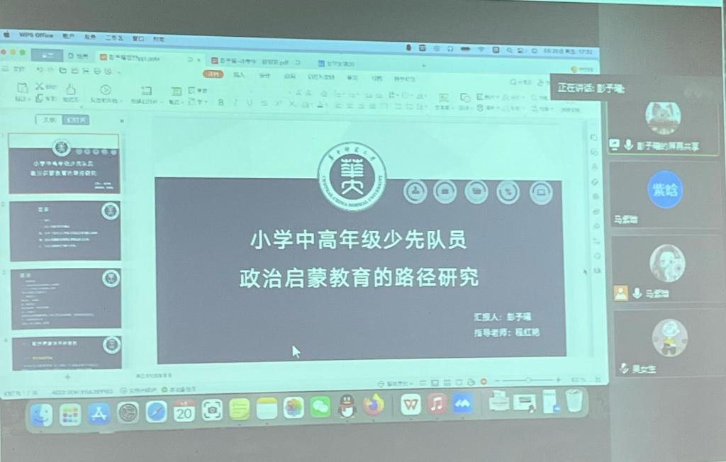 孙文静分别从绪论、正文及结语三个方面进行答辩汇报。基于戈夫曼的拟剧理论,她对学校少先队活动三种课程展开研究分析,主要回答了四个问题:第一,表演要素在少先队活动课程中如何体现?第二,表演会对少先队产生哪些影响,以及存在哪些不足?第三,不足的原因是什么,以及如何改变表演的不足?第四,少先队活动课程表演过程中的真实性如何体现?