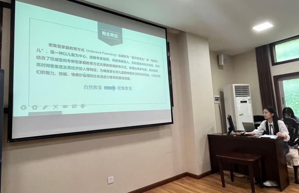 易欢欢从研究思路与过程、论文框架与内容以及论文总结与不足三方面进行答辩。首先,她对“密集型家庭教育方式”的概念进行界定,并以流程图的形式介绍了论文的研究思路及研究过程;之后,她展示了论文的四部分框架,尝试在中国文化大背景下分析我国密集型家庭教育的现实样态、突出弊端和形成原因,并从营造良好的家庭教育氛围、缓解教育制度环境压力和健全家庭教育社会支持体系三方面提出改进策略。最后,答辩人分析了该研究的不足与局限之处。
