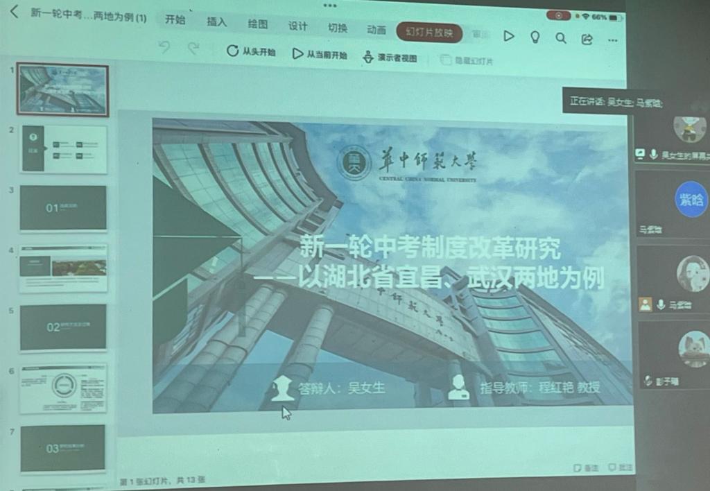 针对吴女生的硕士论文,答辩委员会进行了评价与提问。孙银光博士建议将题目改成区域比较研究,因为其样本的选择难以代表湖北省;并且提出两个疑问:一是能不能结合职业教育法的颁布谈一下中考制度的发展方向,二是怎么看待中考和高考接轨的必要性问题。张添翼副教授指出中考的性质决定了其竞争性和选拔性难以变更,他希望知道新中考制度改革后学校做出了哪些变革,相比之前是否有明显变化和积极意义。刘长海教授对于推进中考省级统一命题能否达到中考制度改革目标提出了疑问。