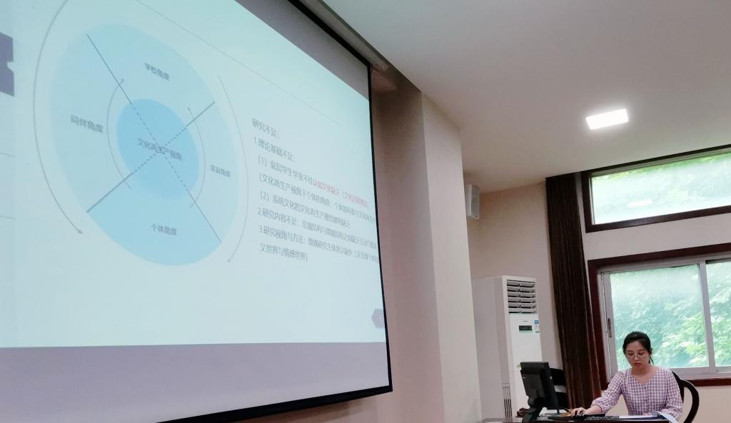 博士生杜佳慧指出该论文旨在从个体认知文化角度补充与完善文化再生产理论,从而探求底层学生学业不佳的原因。她从问题提出、研究意义、文献综述、研究思路与方法和论文大纲五个方面展开介绍。一是问题提出。她指出关注底层弱势学生的教育是国家政策的重要内容;教育有必要关照底层学业不佳学生的现实处境、个人学习体会与现实情境的体验;同时底层学生学业发展虽有改善但仍面临巨大挑战。二是研究意义。她认为该研究具备补充与完善文化再生产理论的理论意义;也能充分关注底层学业不佳学生日常生活的诉求并探寻深层原因,以便更好发挥教育的实践意义。三是研究综述。通过广泛收集资料,了解当前学界对学生学业成绩影响因素和文化再生产理论及其影响学业成绩研究的最新成果,并在此基础上形成了自己的研究问题。四是研究思路与方法。研究思路是探求底层学校生存境遇,寻找学校内部教育排斥机制与家庭教育强化机制,形成个体认知文化,构建文化再生产机制模型,并尝试提出破解机制的策略。研究方法是文献研究法、观察法、访谈法、个案研究法、教育叙事法、实物分析法。最后,她提出该研究目前面临的问题与困惑,并介绍了下一步研究计划。