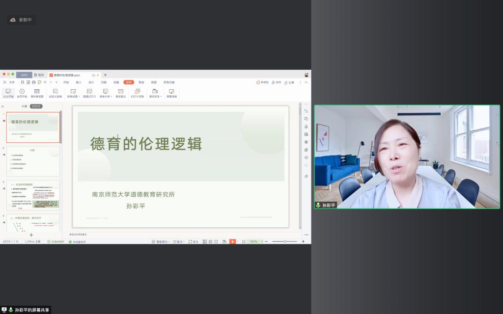孙彩平教授首先从生活的伦理逻辑出发提出问题:什么是生活的逻辑、在什么意义上的生活逻辑可以成为德育教材的逻辑。其次,她基于中国伦理结构——修齐治平,总结了两点:一是历史经验论的总结,这是一种生活的直观,指向社会治理;二是类发生逻辑,这是一种学的逻辑。随后,孙彩平教授根据四位学者的思想描绘了伦理的精神超越轨迹。从福柯的西方古典伦理解释到黑格尔的家-族-国-世界情怀,再到舍勒的人格与价值秩序、列维纳斯的自我无限扩展。最后,她在德育是精神培育实践、德育的核心是精神/伦理培育、精神实践的核心是不断走向无限的精神力量的论述基础上,提出了德育的伦理逻辑即精神格局发展的动态逻辑、时空二象的动态统一。